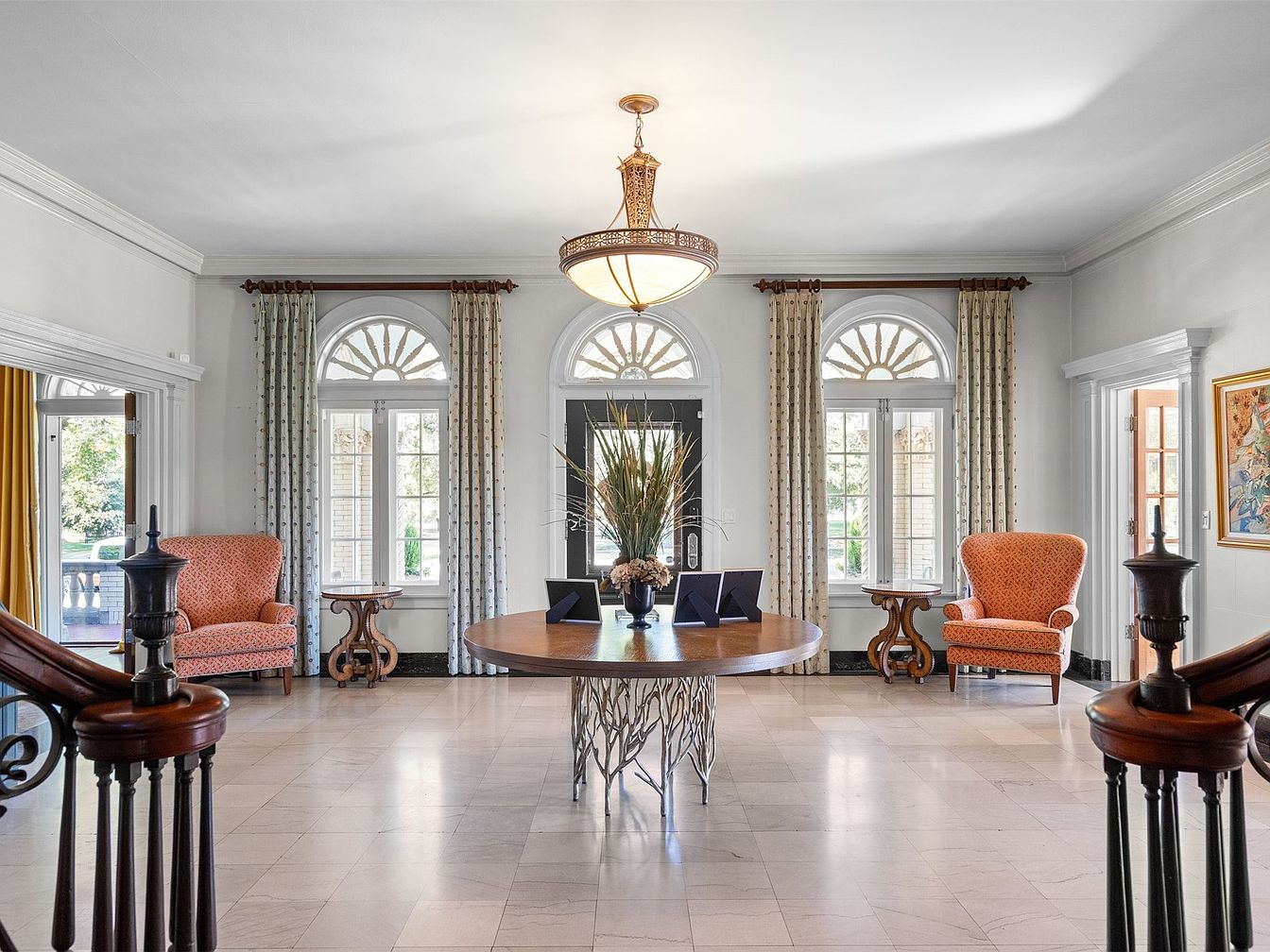 A spacious and inviting grand foyer features elegant cream-colored marble floors and crisp white walls accentuated by intricate crown molding. Three large French doors, each topped with graceful fan-shaped transom windows, allow sunlight to stream into the room, creating a bright, cheerful atmosphere. Stylish patterned drapes frame the windows, adding both privacy and sophistication. In the center, a round wooden table with an artistic metal base displays tasteful floral arrangements for a welcoming touch. Two comfortable orange patterned armchairs offer a restful spot, balanced by classic side tables. This airy space ensures a family-friendly, open transition to the rest of the home.