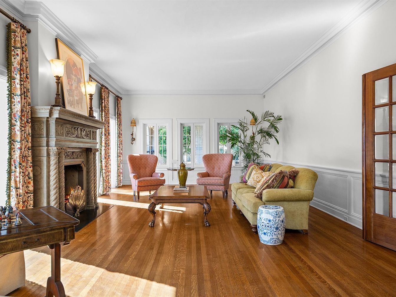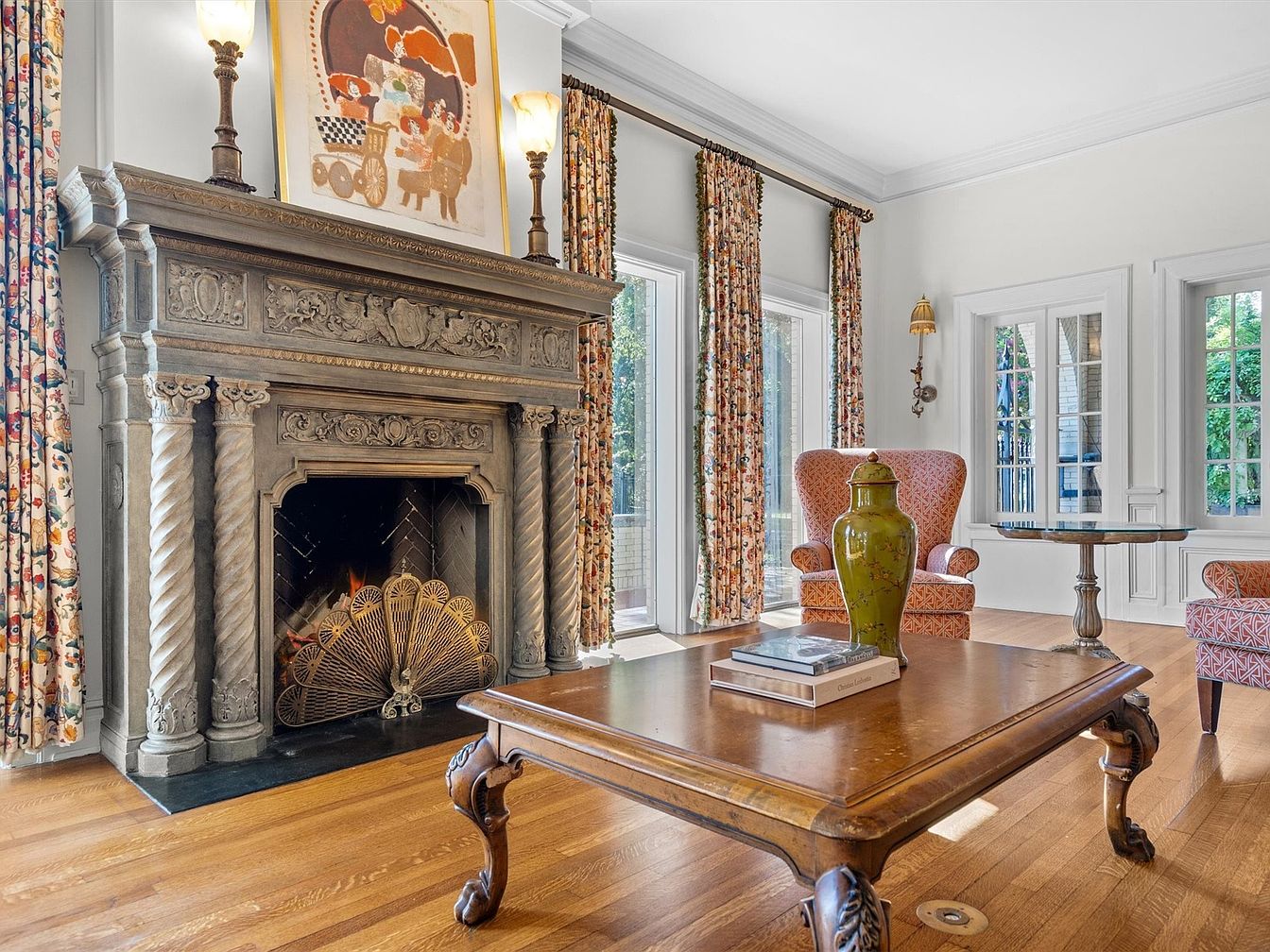 A spacious and elegant living room with warm hardwood floors and ample natural light pouring through a row of multi-paned French windows. The centerpiece is a grand ornately carved stone fireplace, flanked by floral curtains that bring warmth and charm to the room. Comfortable seating includes a soft olive-green family sofa adorned with colorful patterned pillows, and two classic wingback chairs in a coral-pink hue, perfect for gatherings or quiet reading. There’s a sturdy wooden coffee table, a ceramic garden stool, and potted greenery adding fresh energy. The décor and soft neutral walls create a welcoming, family-friendly atmosphere ideal for relaxation and entertaining.