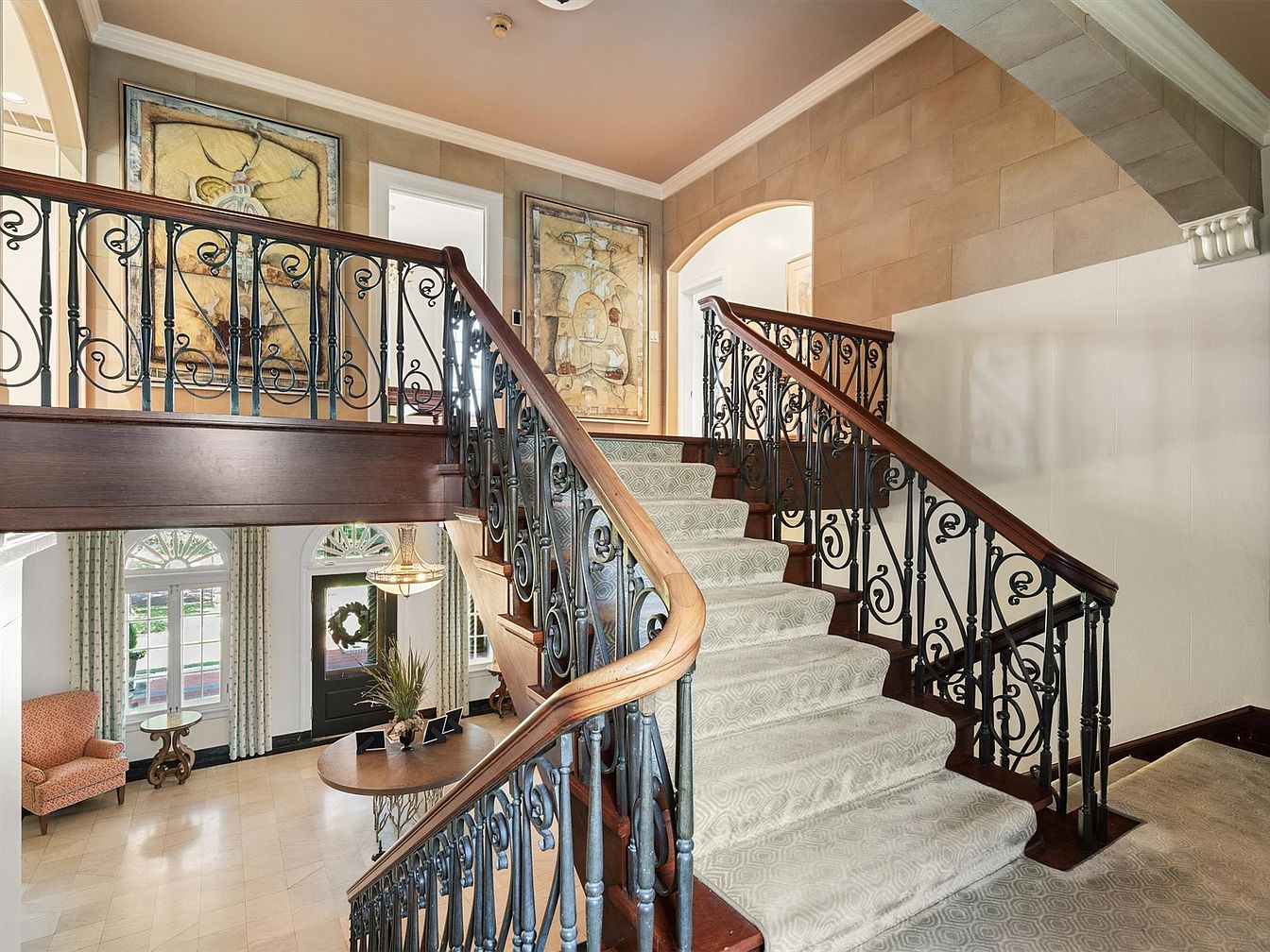 A spacious entryway features an elegant, carpeted staircase with dark wooden handrails and ornate black wrought iron balusters. The layout is open and inviting, ideal for families with its wide, easy-to-navigate steps. Natural light fills the space from large arched windows, highlighting the neutral beige walls and polished tile flooring. A round wooden table sits at the base of the stairs, perfect for decorative displays or family keys and mail. Comfortable seating is offered by a patterned armchair near the entry. Artistic wall hangings and crown molding add refined touches, creating a welcoming and stylish transition point within the home.