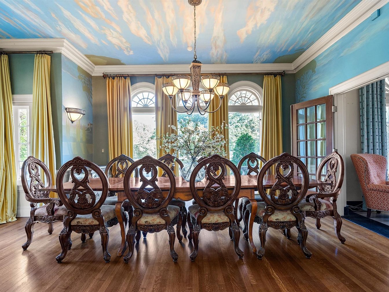 A spacious, elegant dining room furnished with a large, polished wooden table surrounded by intricately carved chairs, each offering sturdy support for comfortable family gatherings. The room features tall arched windows, letting in natural light, framed with golden yellow curtains that add warmth to the blue and green painted walls. The sky-themed ceiling adorned with soft clouds gives the space an airy, whimsical feel. Ornate light fixtures hang above the table, enhancing the inviting ambiance. Wooden floors add richness and continuity, while a glass-paneled door and an accent chair in soft coral lend a touch of coziness, making the room perfect for family meals and celebrations.