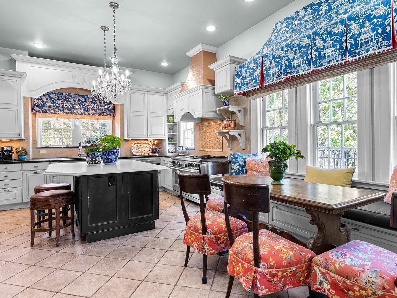 A spacious kitchen combines functionality with inviting, family-friendly design. An island with a white countertop and dark base offers extra prep space, surrounded by cozy bar stools perfect for informal gatherings. The kitchen boasts white cabinetry, soft beige backsplash, and stainless steel appliances, while a window-side breakfast nook features a built-in bench and a solid wooden table, paired with floral-upholstered chairs in warm coral tones. Large windows fill the room with natural light, accentuated by bold blue-and-white patterned valances. Potted plants add a touch of greenery, and a chandelier overhead brings a touch of elegance to this welcoming hub for daily family life.