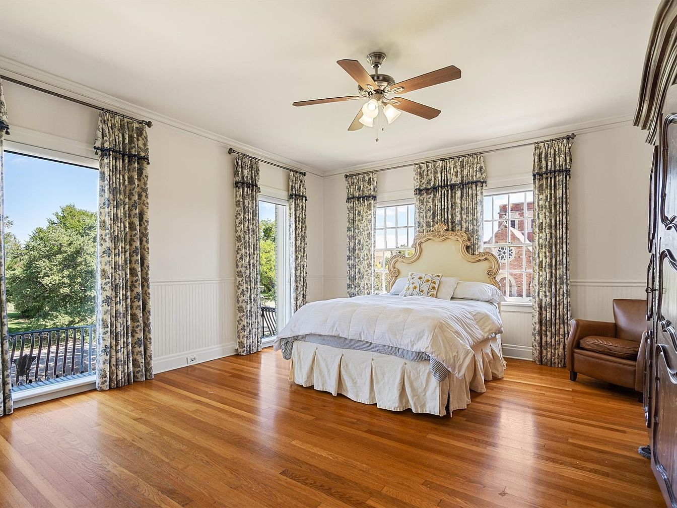A spacious, light-filled bedroom features rich hardwood floors and large windows that bring in natural sunlight and provide scenic views of lush greenery and a charming neighboring home. The centerpiece is a regal, ornately carved bed with plush white bedding, offering a cozy sleep retreat. Patterned drapes in soothing blue and cream add elegance and can be drawn for privacy, making it family-friendly. The neutral color scheme of white walls and crown molding creates a calm atmosphere, while classic furnishings, such as a comfortable leather armchair and a grand wooden armoire, provide both style and practical storage space, perfect for family living.