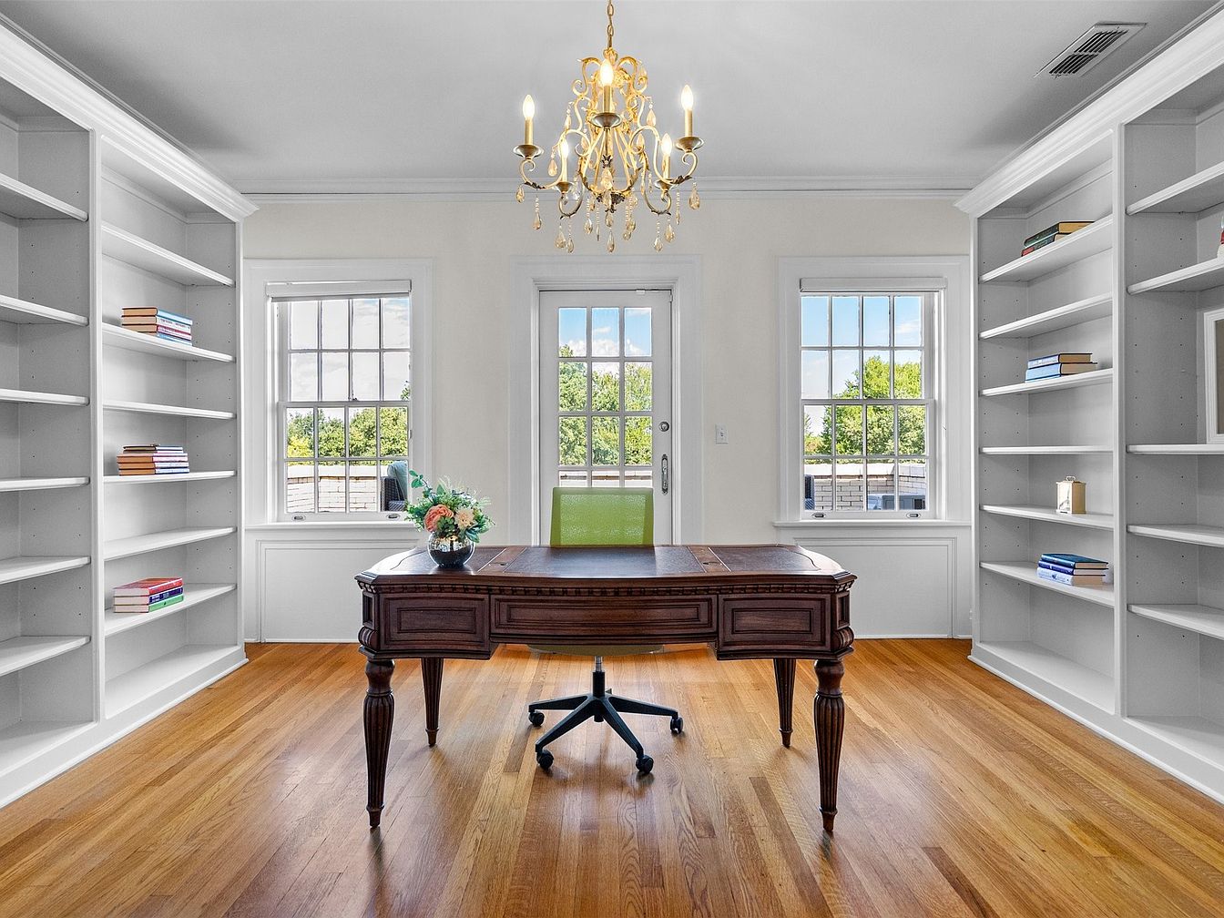 This bright and inviting home office features elegant hardwood floors and a spacious layout ideal for both work and study. Large windows on either side of a glass door allow abundant natural light, creating a cheerful atmosphere perfect for families. Built-in white bookshelves span both walls, providing ample storage for books and supplies, making organization easy. A classic wooden desk with carved legs is positioned centrally with an ergonomic chair, encouraging productivity. The chandelier overhead adds a touch of sophistication. Thoughtfully arranged with clear lines and neutral tones, this space easily doubles as a quiet study area for children or adults alike.
