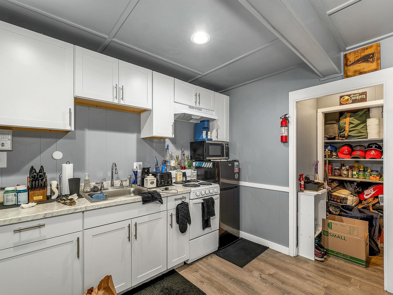 A compact kitchen features sleek white cabinetry, creating a bright and airy atmosphere. A gray backsplash complements the cabinetry, while the countertop boasts a light, speckled design that integrates practicality and style. A stainless steel sink sits centrally, flanked by essential appliances like a microwave, toaster, and a black stove. Various bottles and kitchen items are artfully displayed, hinting at its active use. To the right, an open pantry reveals organized shelves filled with food, equipment, and caps, showcasing a blend of functionality and personal touch. Soft lighting adds warmth to this cozy space.