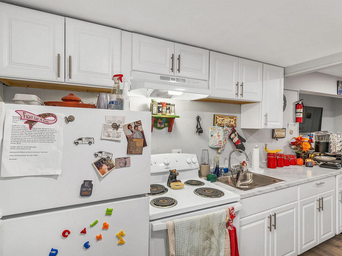 A compact kitchen features white cabinetry with sleek hardware, providing a clean and modern aesthetic. The countertop displays a marbled surface, enhancing the bright ambiance. A stove sits beside a shiny stainless steel sink, with various utensils neatly organized. The refrigerator is adorned with magnets, notes, and photographs, showcasing personal touches that add warmth. Colorful items line the shelves, including jars and flowers, creating a lively atmosphere. Practical elements like a fire extinguisher and spice rack ensure functionality. Overall, the space blends practicality with inviting decor, reflecting a vibrant and lived-in feel.