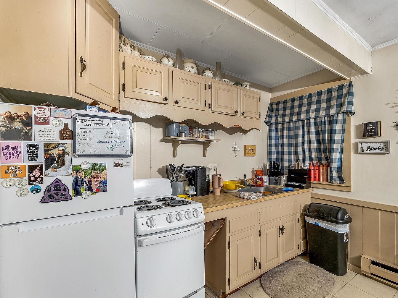 A cozy kitchen with a light beige color scheme, featuring wooden cabinetry above and beside a white stove. The countertop is spacious and clean, adorned with everyday kitchen items. A vintage-style fridge covered with colorful magnets draws attention. A blue and white checkered curtain frames the window, harmonizing with the homey feel. The sink area is organized, displaying a few pots and utensils. Below the counter, dark cabinets offer storage, while a bin is strategically placed beside the cabinetry. The overall ambiance combines warmth with practical use, creating an inviting cooking environment.