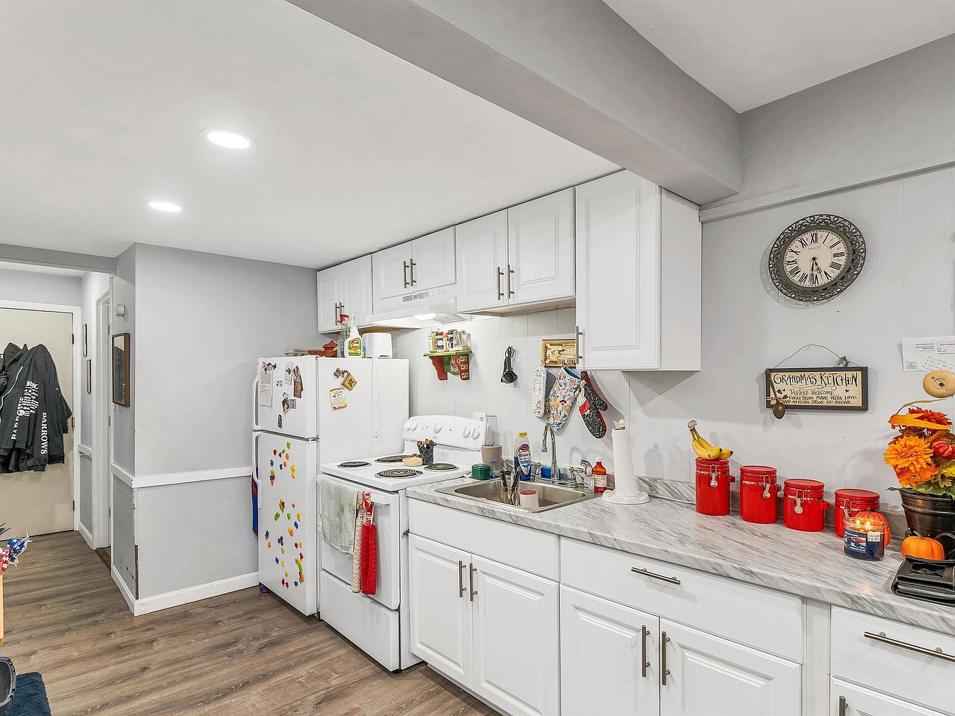 A compact kitchen featuring a functional layout with modern white cabinetry against a light gray wall. The countertop showcases a marbled finish, adding elegance. Below, red storage canisters and decorative items, including flowers and candles, provide vibrant splashes of color. A refrigerator adorned with magnets emphasizes a personal touch, while an open floor plan enhances accessibility. The wooden flooring offers warmth, contrasting with the sleek cabinets. Practical appliances, including a stove and sink, are neatly arranged, ensuring efficiency. Bright, recessed lighting creates an inviting atmosphere, perfect for culinary activities.
