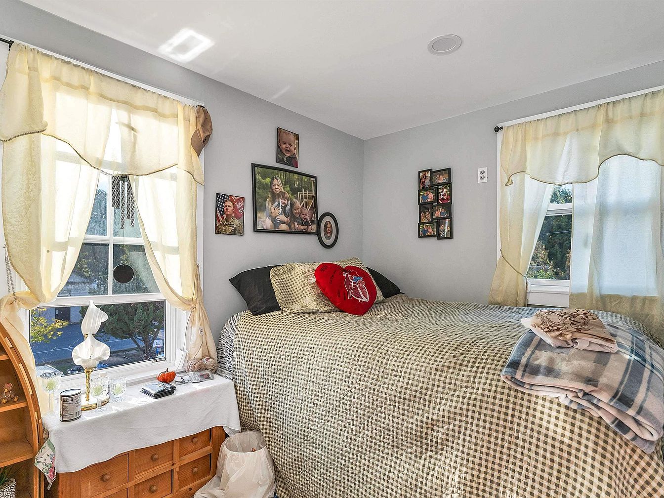 A cozy bedroom featuring warm gray walls that complement a plush bed adorned with a checkered quilt. Natural light floods in through white-framed windows, adorned with sheer, creamy curtains that sway gently. A collection of framed family photos decorates the walls, adding a personal touch. To the side, a wooden dresser provides practical storage while displaying decorative items. A bedside lamp with a delicate design sits on the dresser, enhancing the room’s charm. The overall aesthetic conveys a sense of comfort and nostalgia, creating an inviting atmosphere perfect for relaxation.