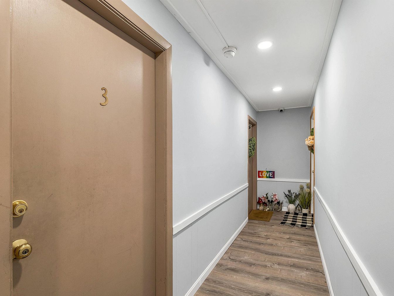 This narrow hallway features a soft gray color scheme with sleek white wainscoting. The smooth, light wood-like flooring runs the length, enhancing the airy feel. On the left, a subtly textured door marked ‘3’ has a polished brass handle, while cozy decorative elements peek from the doorframe of an adjoining room. A small collection of faux plants and a decorative rug add warmth at the end of the hall. The modern recessed lighting brightens the space, creating a welcoming atmosphere. Overall, the design is simple yet elegant, balancing functionality with faint touches of personalization.