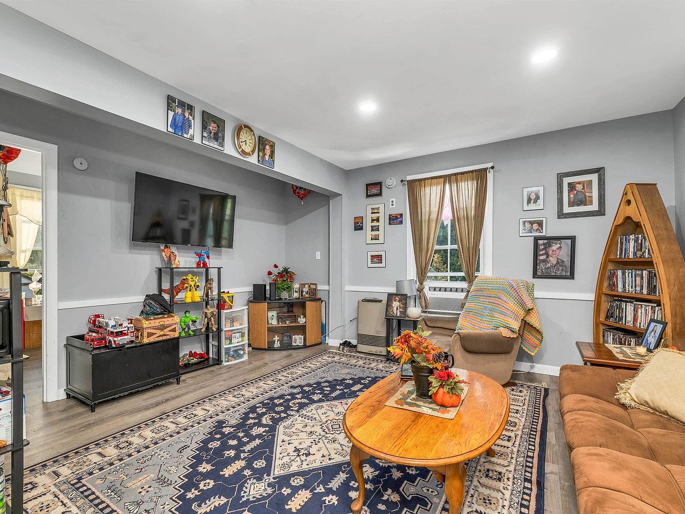 A cozy living room is showcased, featuring a neutral gray color scheme with warm wooden accents. The space has a traditional feel, highlighted by a large, vintage area rug that anchors the room. A plush brown couch sits opposite a wooden coffee table, adorned with autumn decorations. A media unit holds toys and books, while a modern flat-screen TV is mounted on the wall. Natural light spills from a curtained window, enhancing the welcoming atmosphere. Family photographs and decorative items fill the walls and shelves, creating a personal touch and inviting ambiance.