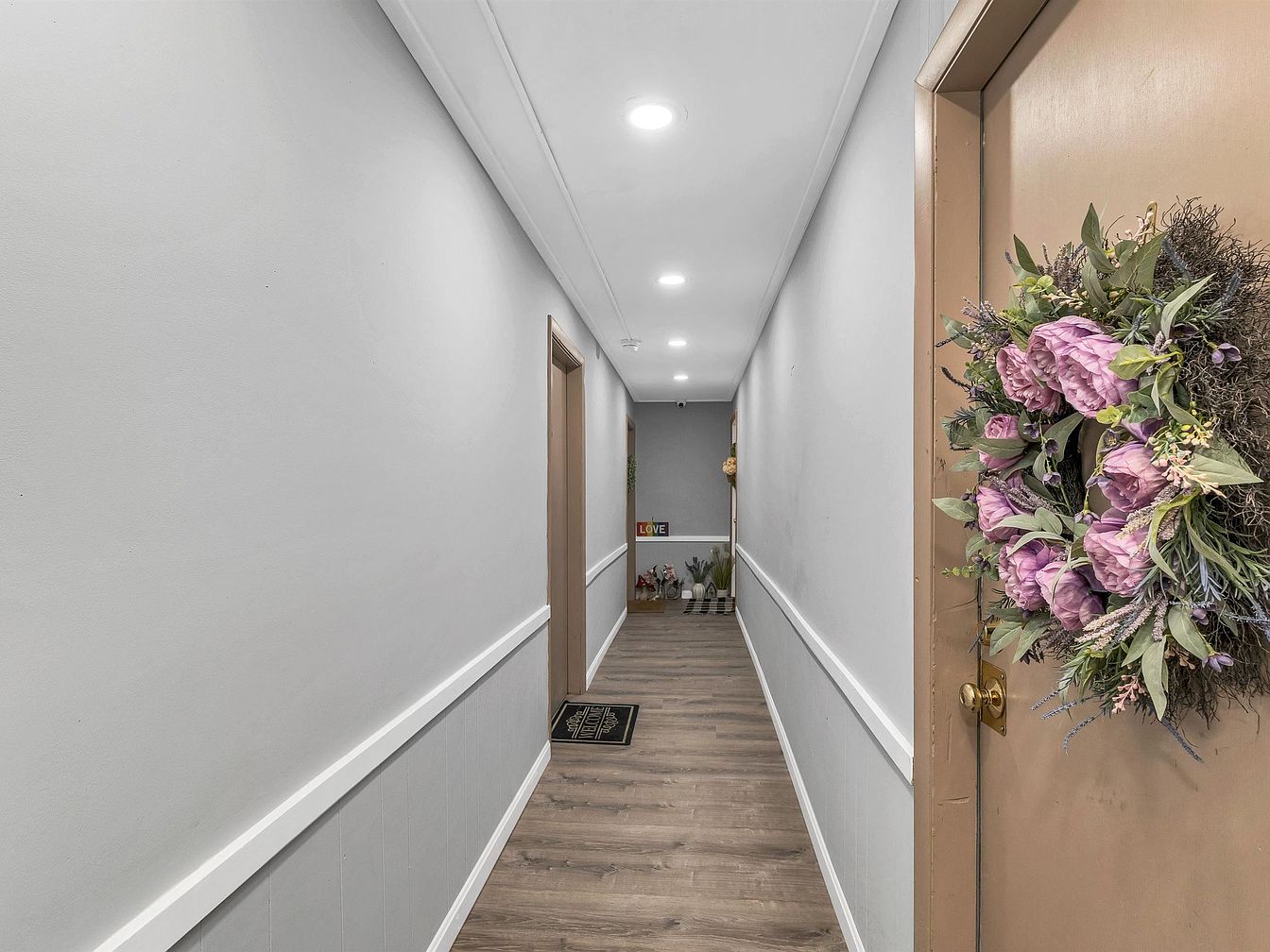 A narrow hallway features a muted gray color scheme with smooth walls and a contrasting white wainscoting that adds a touch of elegance. The flooring is a warm wood tone, enhancing the inviting atmosphere. On the right, doors with simple wood finishes lead to different rooms, framed harmoniously by the wall color. A delicate wreath of purple peonies adorns the door at the end, introducing a splash of color and a sense of warmth. Subtle lighting from recessed fixtures illuminates the space, creating a welcoming path that beckons exploration into the home’s interior.
