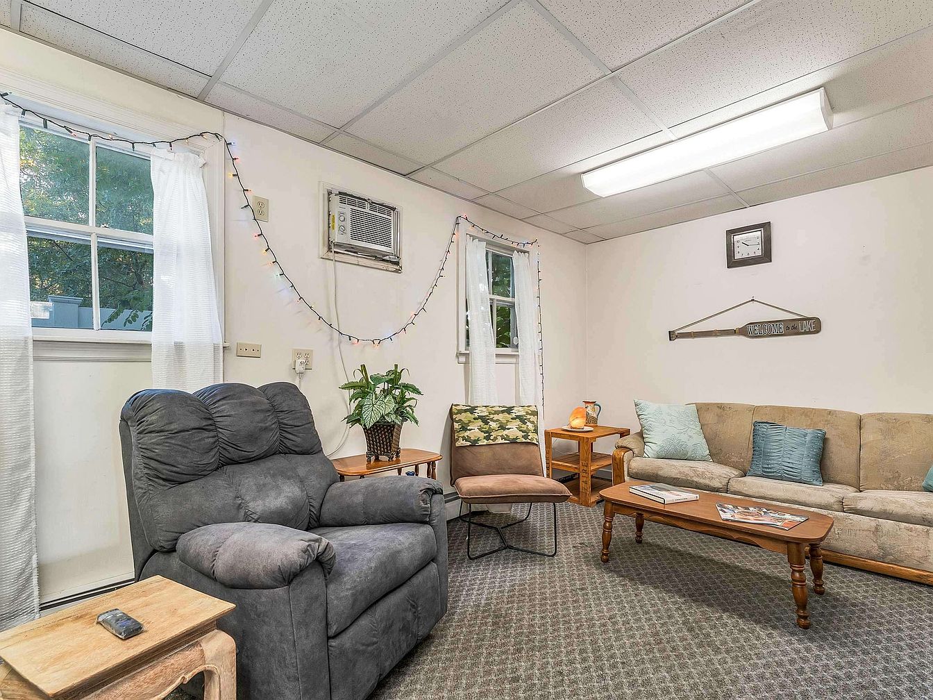 This living room showcases a cozy, welcoming atmosphere. The walls are painted a warm beige, complementing the light gray carpeting. A spacious gray recliner invites relaxation, paired with a brown and cream patterned couch adorned with blue accent pillows. A low wooden coffee table displays magazines, enhancing the informal vibe. Natural light spills in through a large window, draped with sheer white curtains, while playful fairy lights add a touch of whimsy. A wall-mounted clock sits above a rustic wooden sign, reinforcing the charming, homey feel. An air conditioning unit and a green plant add practical comfort and vitality.