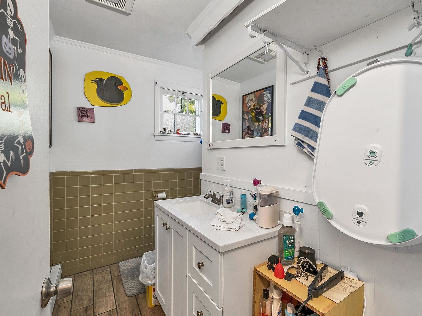 This compact bathroom features a functional layout, showcasing a white vanity with a double sink and storage beneath. The walls are painted in bright white, contrasting with the earth-toned, tiled wainscoting. A playful duck-themed wall decoration adds a whimsical touch, accompanied by a framed poster with vibrant colors. Natural light streams through a small window with simple white trim. The floor is covered in wood-like porcelain tiles, enhancing a warm aesthetic. The decor is practical, with toiletries and towels organized on shelves and surfaces, providing a cozy, lived-in feel, complete with playful accents to create a cheerful atmosphere.