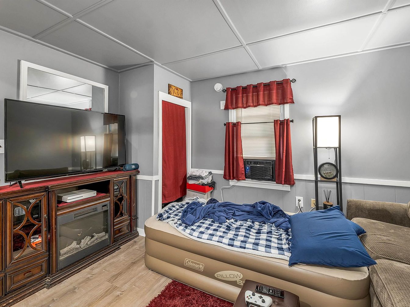This cozy guest bedroom features a multifunctional space designed for comfort and relaxation. The walls are painted a soft gray, complemented by vibrant red curtains framing a small window, allowing natural light to filter through. An air conditioning unit peeks through the window for added comfort. A traditional wooden entertainment unit houses a large flat-screen TV, with decorative glass accents reflecting a vintage charm. The inflatable mattress is unmade with a blue checked blanket and layered pillows, enhancing the casual ambiance. A plush sofa sits on one side, along with a sleek floor lamp illuminating the room with a warm glow.