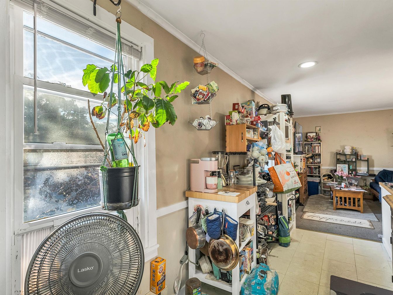 This kitchen blends functionality with a lived-in charm. A light color palette of beige walls enhances the sense of space, illuminated by natural light streaming through a window adorned with a potted plant. Shelves brimming with kitchenware contrast with a modern countertop appliance in soft pink, showcasing personalized touches. The area features a vintage fan for circulation and hints of rustic charm, evident in the wood shelving holding various cooking essentials. A cozy nook with a table in the background invites gathering, while the overall clutter suggests an ongoing culinary journey, rich with everyday life.