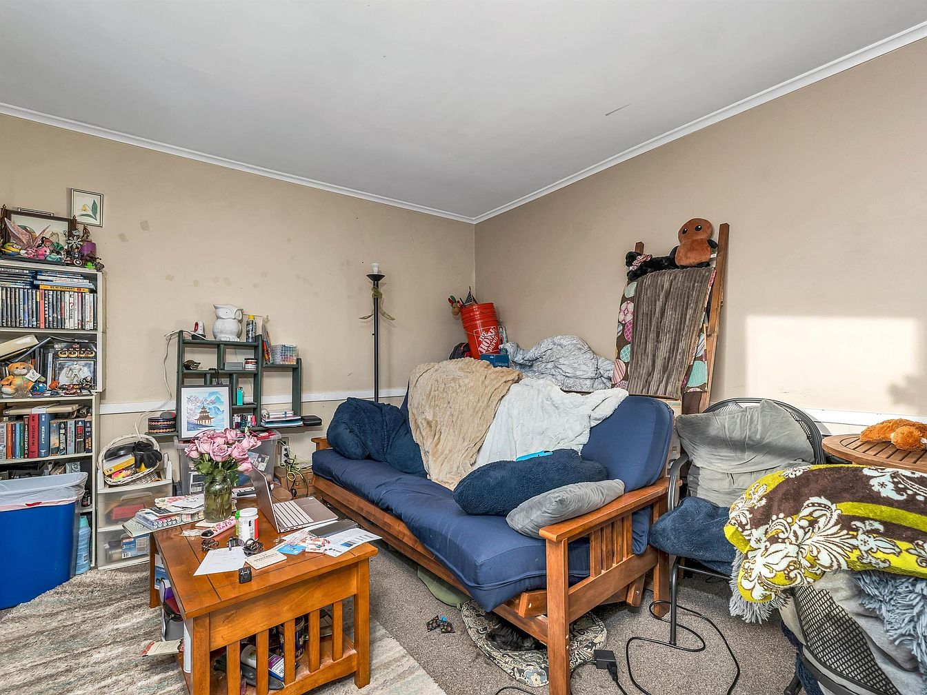 A cozy living room space with a warm, inviting atmosphere. The walls are adorned in a soft beige tone, creating a neutral backdrop for the furnishings. A comfortable blue sofa is piled with colorful throws, suggesting relaxation. Nearby, a wooden coffee table displays scattered magazines and personal items, enhancing the lived-in feel. Dark wooden shelves hold a collection of books and decorative figurines, while a vase of pink roses adds a burst of color. In one corner, a small desk supports a laptop, indicating a multi-functional area. Overall, the room blends comfort with a hint of personality.