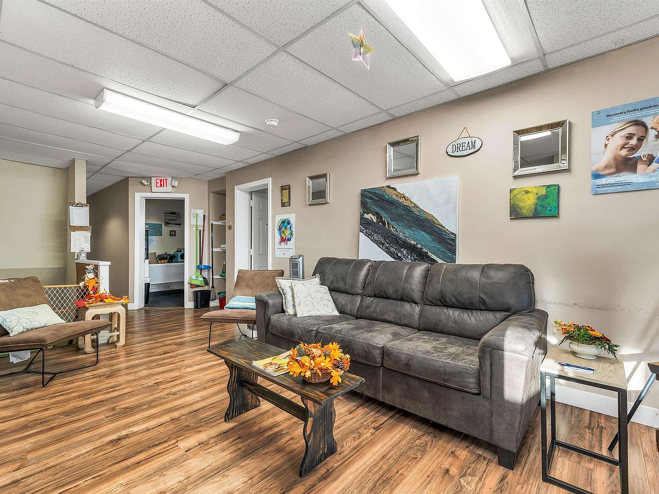 A cozy living room featuring a warm color palette of browns and light neutrals. A dark brown leather sectional sofa is complemented by two small accent chairs with earthy tones and floral cushions. The natural wood flooring creates an inviting atmosphere, while a rustic coffee table adorned with autumn decorations adds charm. Walls are painted in soft beige, adorned with framed artwork, offering visual interest. Modern mirrors reflect light, enhancing brightness in the space. A bright overhead light fixture and ambient natural light flood the room, providing a cheerful and welcoming environment.