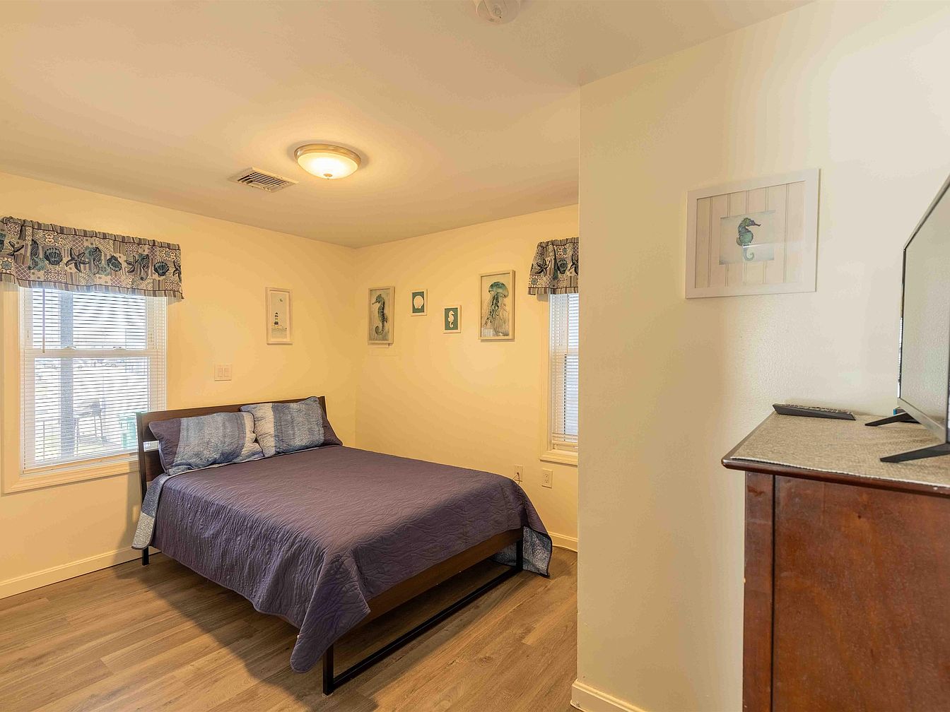 This cozy bedroom features a minimalist design with a contemporary bed frame showcasing a dark wood finish. A rich purple quilt covers the mattress, complementing the light beige walls. Decorative pillows enhance the bed’s comfort. Natural light filters through a set of layered curtains, combining solid blue with an ocean-themed pattern, framing a window that opens to a view outside. Focal art pieces, including seahorse and jellyfish illustrations, adorn the walls, creating a calming atmosphere. A small dresser, topped with a cotton fabric, holds a flat-screen television, merging functionality with style in this inviting, serene retreat.