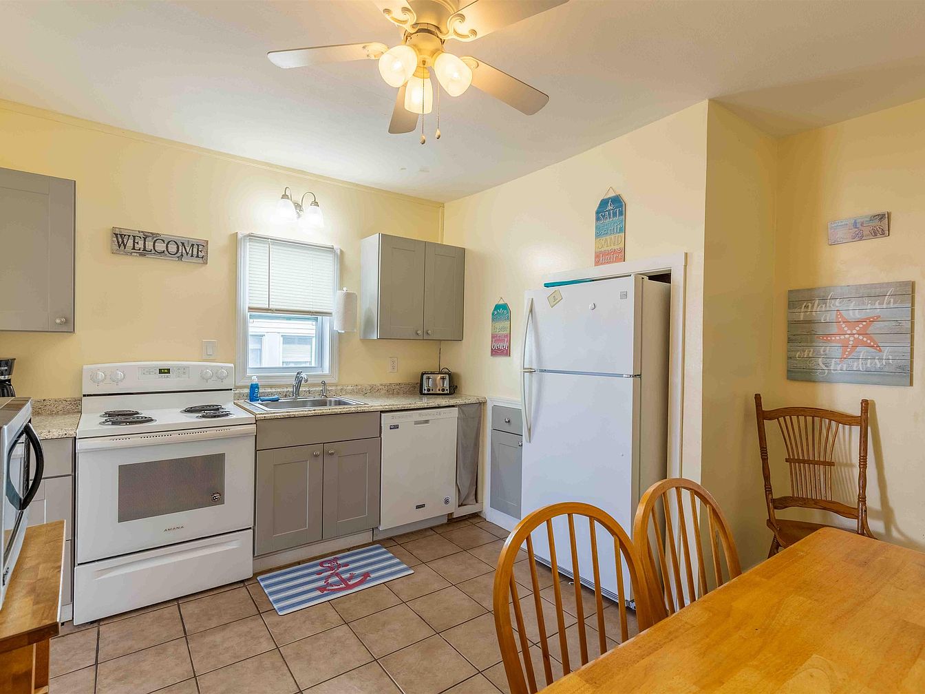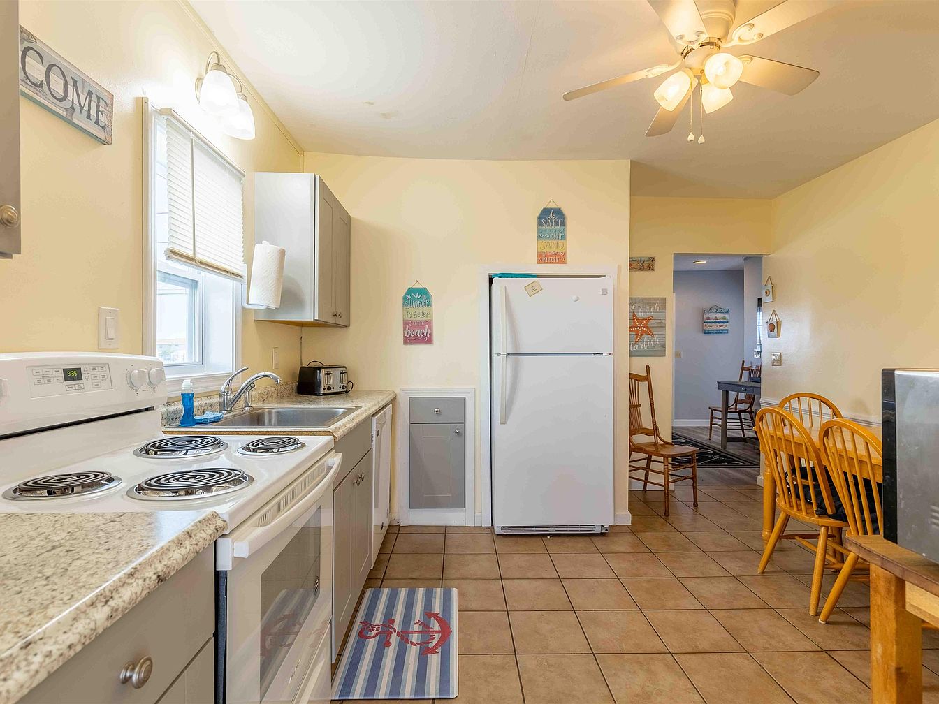 The kitchen features a cozy, welcoming vibe with light yellow walls that enhance its brightness. A modern stove and oven are complemented by a sleek, granite countertop. Above, a stylish ceiling fan provides airflow, while warm lighting fixtures brighten the workspace. Grey cabinetry adds a contemporary touch and contrasts with the white appliances, including a fridge and microwave. The tiled floor, in warm earth tones, extends seamlessly throughout. A small dining area with wooden chairs and a simple table promotes casual meals. Decorative signs on the walls evoke a beach theme, adding personality and charm to the space.