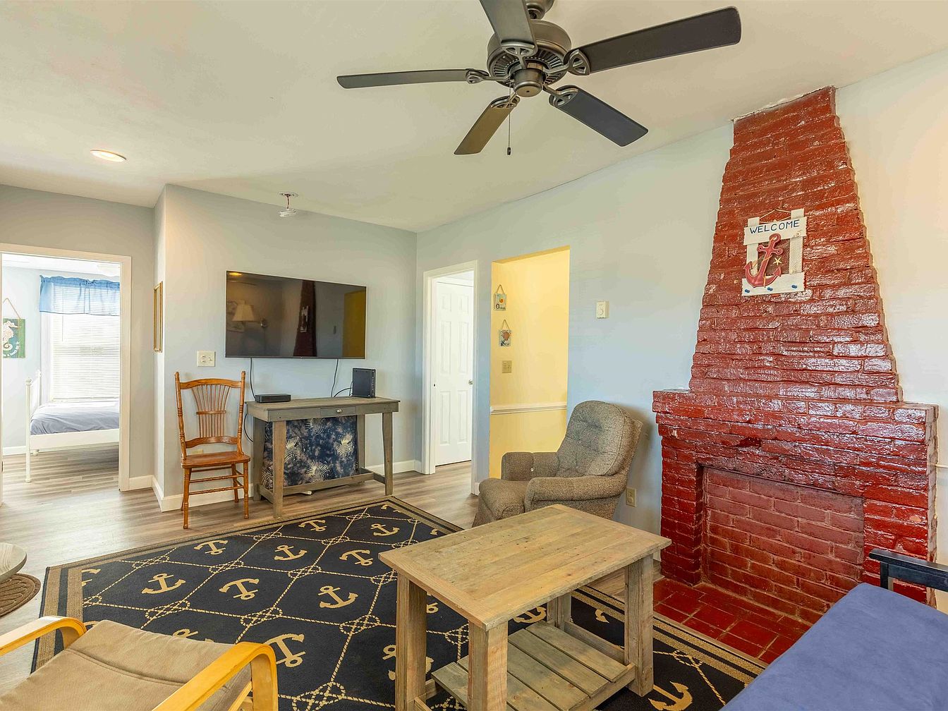 The living room blends rustic and nautical aesthetics. A prominent red brick fireplace serves as the focal point, accentuated by a welcome sign. Light gray walls enhance the space’s warmth, while a nautical-themed rug with anchor motifs adds character. Furnishings include a simple wooden coffee table and a comfortable gray armchair, paired with a wooden chair that evokes a coastal vibe. A mounted flat-screen TV integrates modern technology within the historic charm. The room is well-lit by natural light flowing from nearby windows, creating an inviting atmosphere perfect for relaxation or social gatherings.