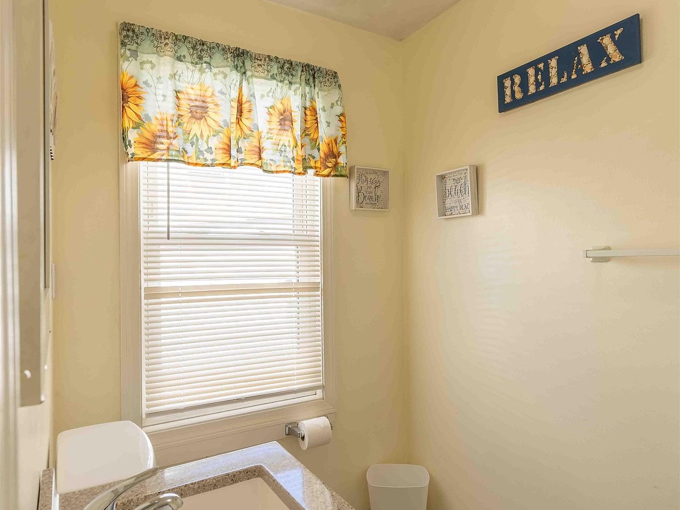 A serene bathroom space featuring soft yellow walls that exude warmth and coziness. Natural light filters through a white-blind window, adorned with cheerful sunflower curtains that add a splash of color. A simple, white sink is accompanied by a sleek faucet and a modern countertop. Above the sink, framed decorative art pieces in muted tones enhance the decor without overwhelming the space. A blue wooden sign with ‘RELAX’ is prominently displayed, reinforcing a tranquil atmosphere. The room is punctuated by minimalistic storage, including a small trash bin, creating a clean and inviting environment.