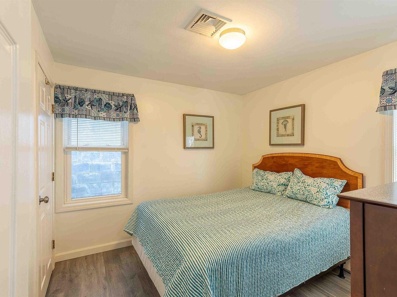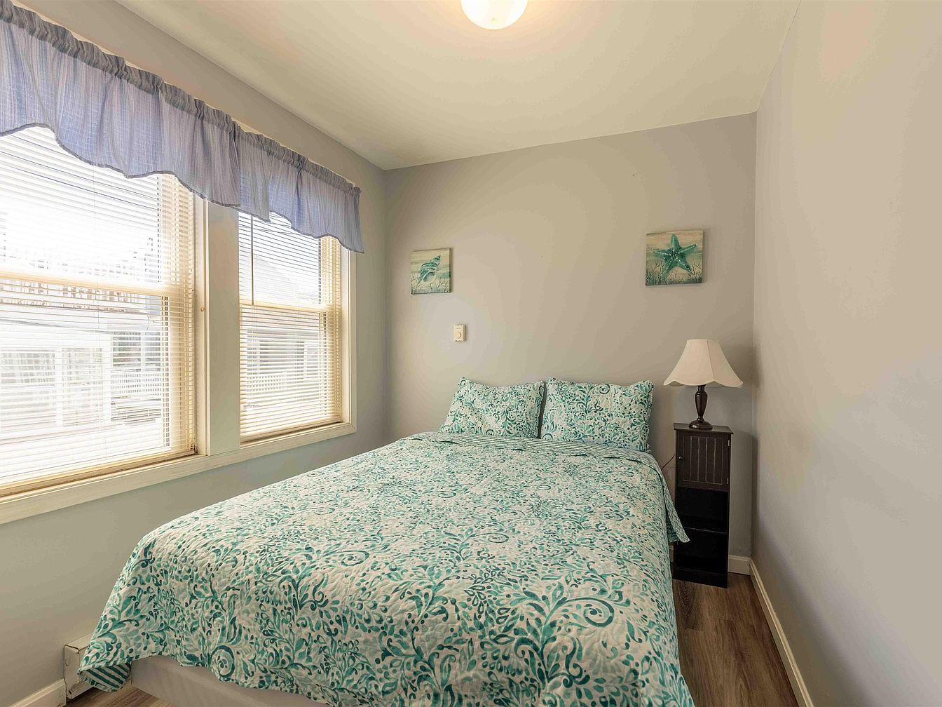 A cozy bedroom featuring a double bed adorned with a vibrant teal and white patterned quilt, complemented by matching pillows. Natural light pours in through two large windows, dressed in soft blue valances. A simple white bedside lamp sits atop a small black nightstand, adding a touch of functionality. The walls are painted in a light grey hue, creating a serene backdrop that enhances the overall tranquility of the space. Minimalist decor includes small art pieces of a starfish and a beach scene, reinforcing a coastal aesthetic. The flooring is a warm brown, inviting an intimate and relaxing atmosphere.