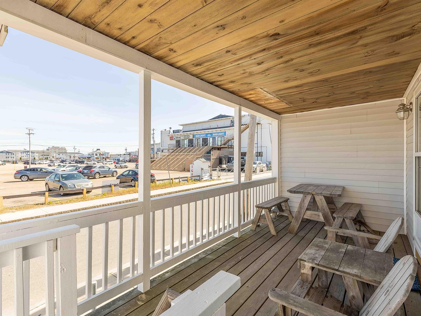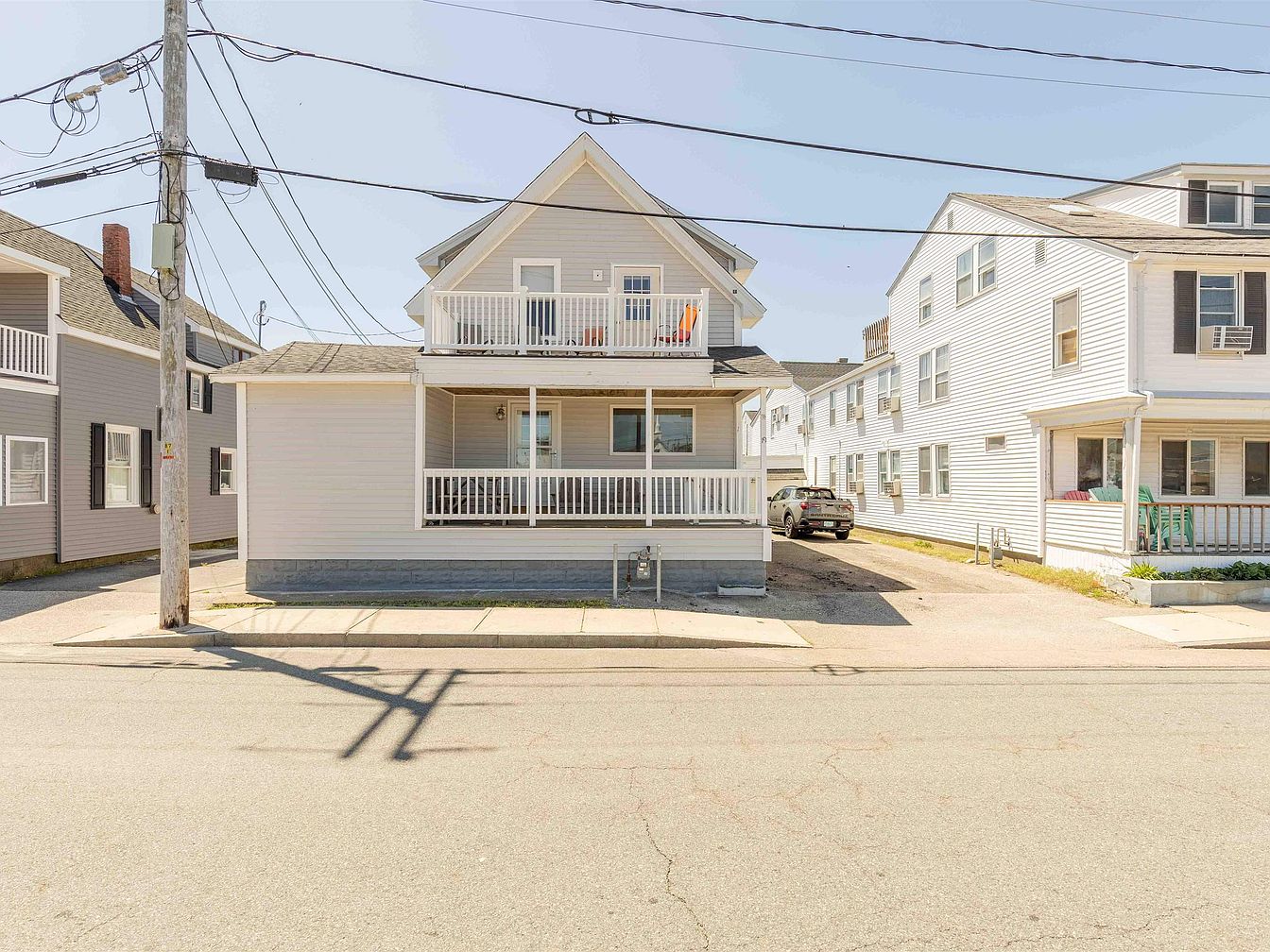 This image showcases a charming beach house, positioned prominently on a quiet street. The house features a light-colored wooden exterior, accented by white railings on the porches, which invite relaxation. A spacious front porch is visible, offering an area for outdoor seating. The roof slopes gently, hinting at a classic architectural style. Adjacent to the house, other similar buildings create a cohesive neighborhood feel. A driveway leads to a private parking space, indicating convenience. Surrounding greenery adds a touch of nature, while utility poles and wires suggest a functional, everyday setting.