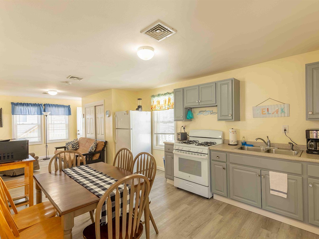 This cozy kitchen showcases a functional layout with light grey cabinetry that contrasts charmingly against a warm yellow wall. A classic white gas stove sits alongside a double stainless steel sink, while a black countertop provides a practical workspace. A small dining table with wooden chairs is centrally located, adorned with a black and white checked runner, creating a welcoming atmosphere. Large windows, dressed with blue curtains, allow natural light to flood the space, enhancing the airy feel. A subtle beach-themed décor element hangs above the sink, echoing a relaxed vibe, complemented by a plush futon positioned nearby.