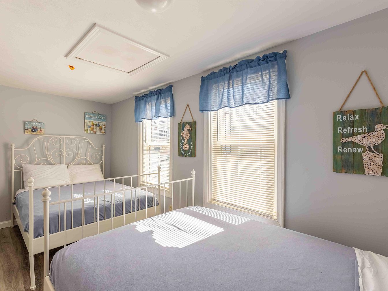 A cozy bedroom featuring twin metal frame beds, one with a light blue blanket. Soft gray walls enhance a tranquil atmosphere, complemented by white bedding. Sunlight filters through two large windows adorned with delicate blue valances, creating a cheerful ambiance. Decorative wall art includes vibrant seaside-themed pieces and a rustic sign with motivational words, enriching the space’s beachy feel. The hardwood floor adds warmth, while the overall layout maintains an open and inviting vibe, perfect for relaxation. Architectural details include a simple ceiling fixture and a discreet access panel overhead, emphasizing functionality without compromising style.