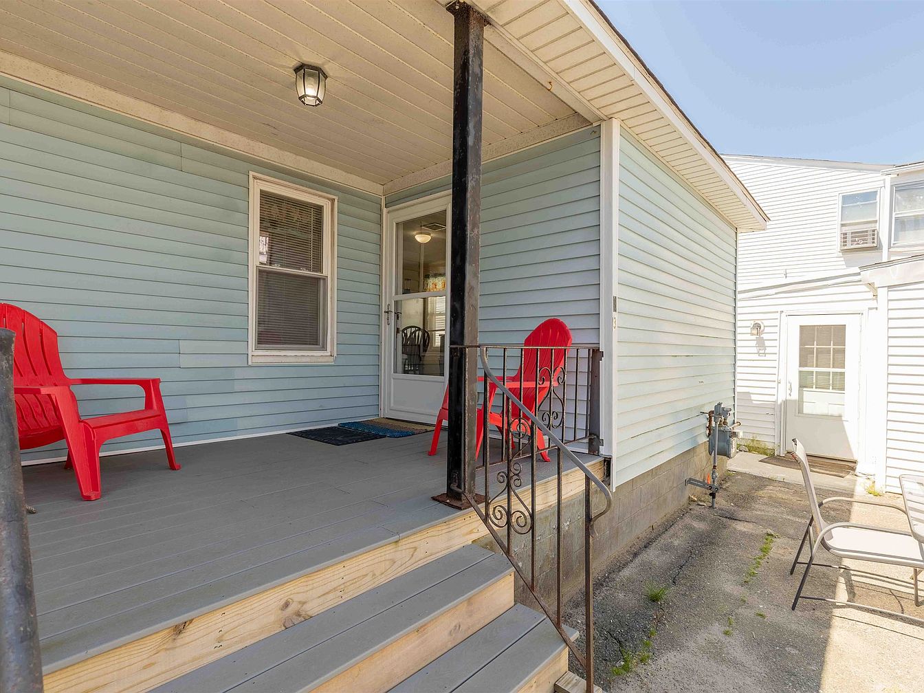 This welcoming front porch features a light blue exterior with horizontal siding, creating a relaxed vibe. Two bright red Adirondack chairs are positioned on a gray, textured deck, inviting relaxation. A sturdy black railing adds a touch of elegance, complementing the aesthetic with its classic design. Sunlight streams onto the space, enhancing the color palette. The entrance has a glass door framed by a detailed white trim, offering a glimpse into the interior. A dark rug at the threshold adds comfort and warmth, while the adjoining yard features a simple concrete area, maintaining a tidy and functional layout.