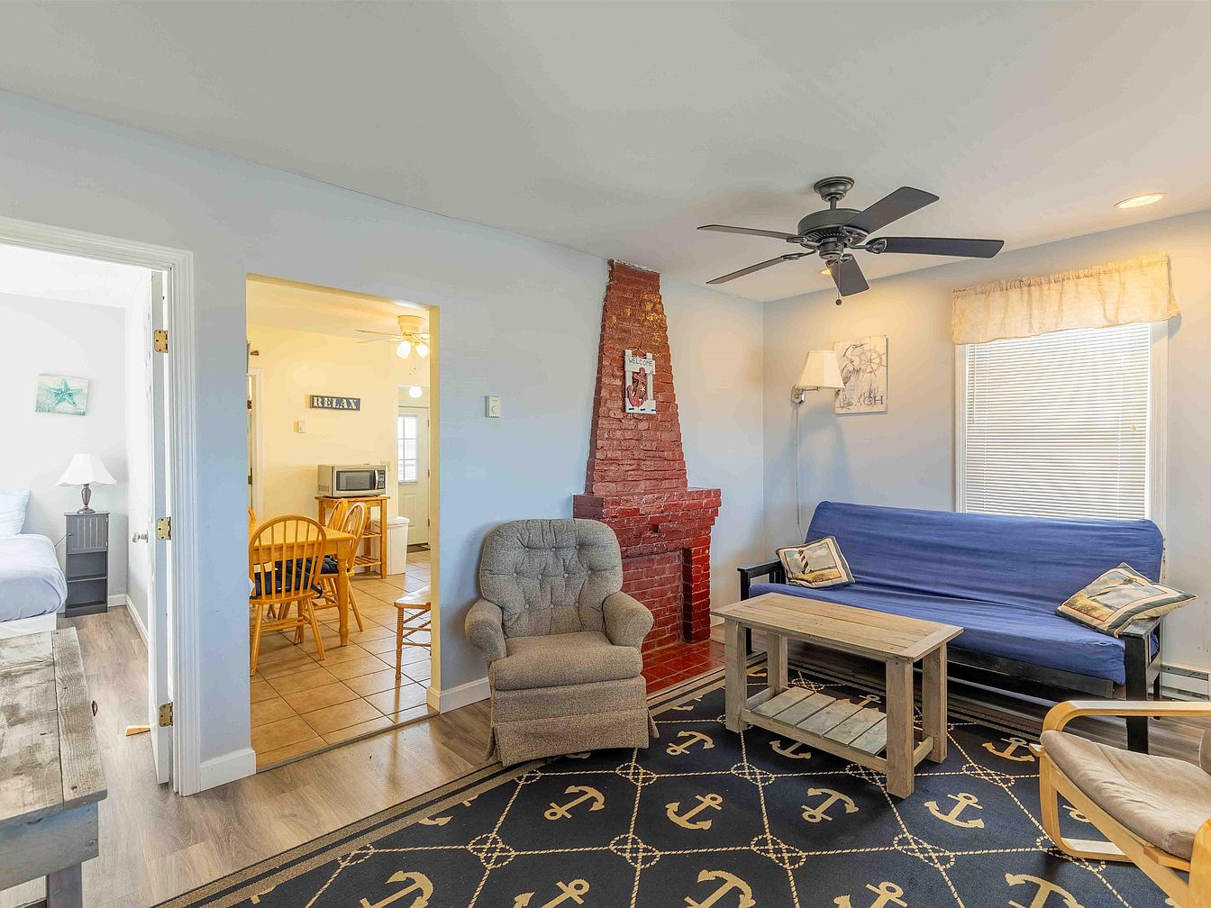 This cozy living room features a relaxed layout with a muted blue color scheme enhancing the tranquil vibe. A prominent brick fireplace stands against one wall, providing warmth and character. Opposite, a blue sofa adorned with decorative pillows invites comfort. A wooden coffee table with a rustic finish sits atop a navy rug decorated with nautical anchors, offering playful charm. Natural light filters through the window, complemented by light fabric shades. A nearby light fixture adds illumination, while a bookshelf and dining area are glimpsed through the doorway, creating a seamless connection to adjacent spaces.