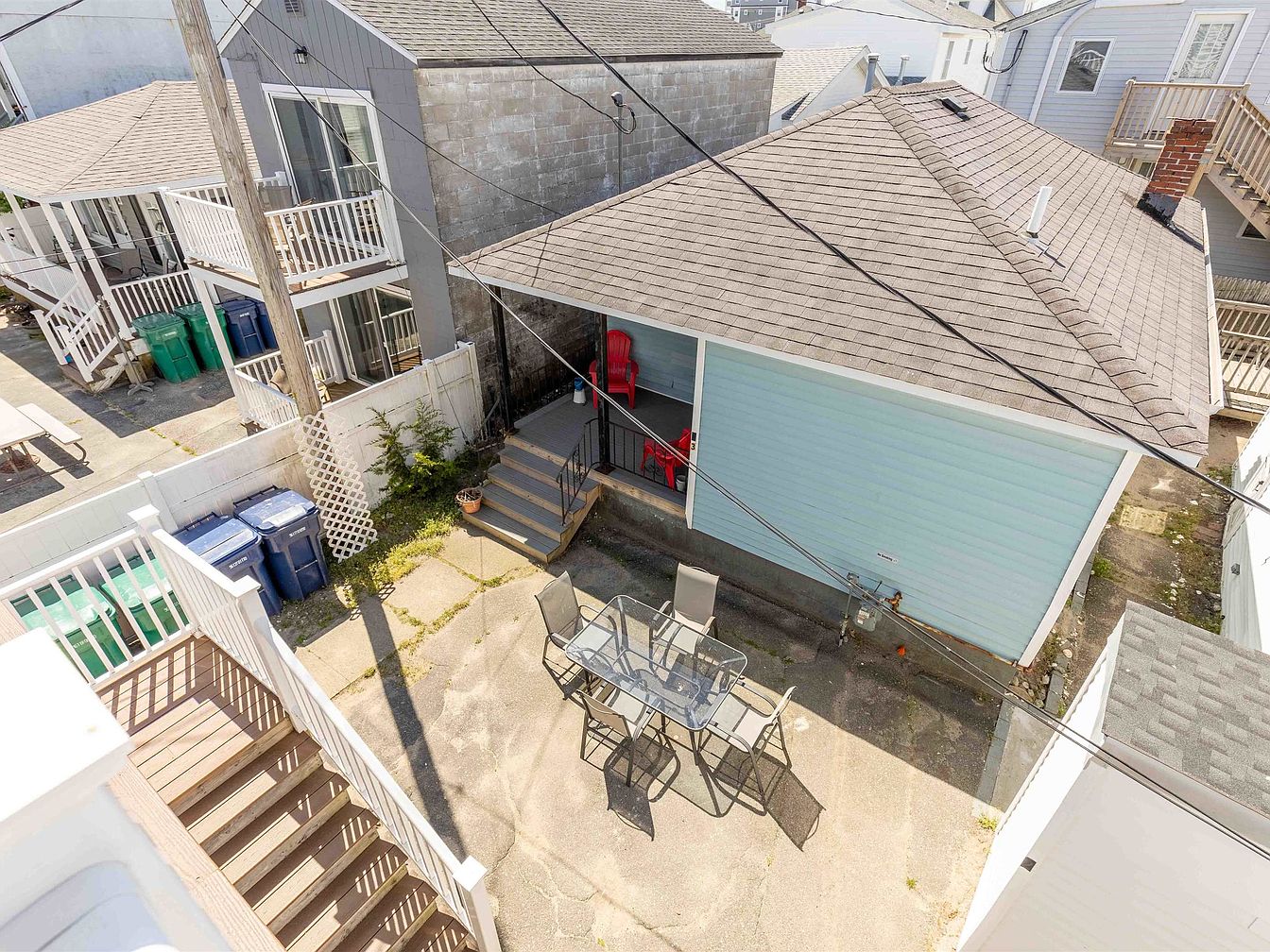 The image showcases an outdoor patio area of a historic American home. A simple table with metal chairs occupies the center, providing a space for gatherings. The patio features a combination of concrete and grassy patches, with hints of greenery along the edges. Surrounding the area are neighboring homes with traditional architectural styles, characterized by sloped roofs and balconies. A blue-colored shed stands prominently, adding a pop of color against the neutral tones of the pavement and nearby structures. Power lines stretch overhead, contrasting the serene outdoor environment, creating a lively yet relaxed atmosphere.