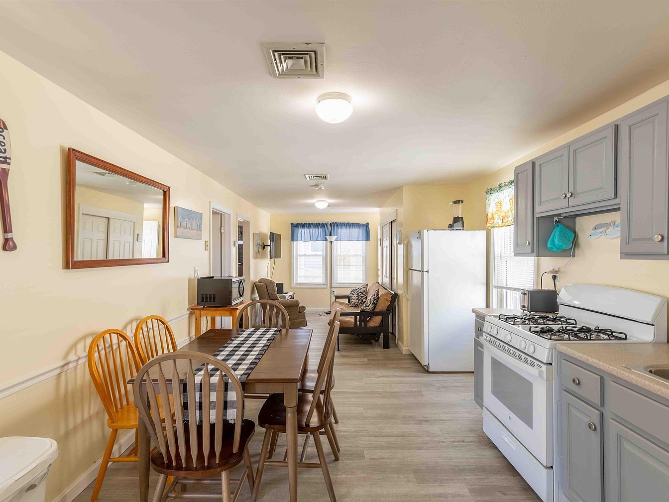 This kitchen showcases a cozy, functional layout with soft yellow walls that brighten the space. A wooden dining table is positioned centrally, surrounded by a mix of wooden chairs, featuring a black-and-white checkered table runner. To one side, a white gas stove and matching refrigerator blend with gray cabinetry, which provides ample storage. A subtle light illuminates the area, enhancing the spacious feel. Large windows dressed in blue fabric allow natural light to flood in, complementing the light wood and gray tones. The overall aesthetic emphasizes comfort and practicality, integrating living and cooking spaces seamlessly.