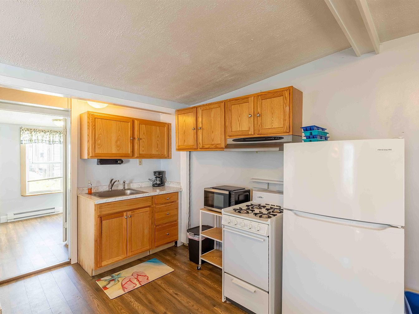 A compact kitchen showcases light wooden cabinetry with a natural finish, providing warmth to the space. A white countertop complements the cabinets, housing a double sink. Modern appliances, including a white refrigerator and stove, are neatly arranged alongside a microwave, maintaining an efficient layout. The light hardwood flooring contrasts with the cabinetry, enhancing the room’s brightness. A window adorned with a patterned valance allows natural light to flood in, illuminating the area. An inviting doormat with a beach design adds a touch of personality, suggesting a relaxed, coastal vibe throughout the kitchen.