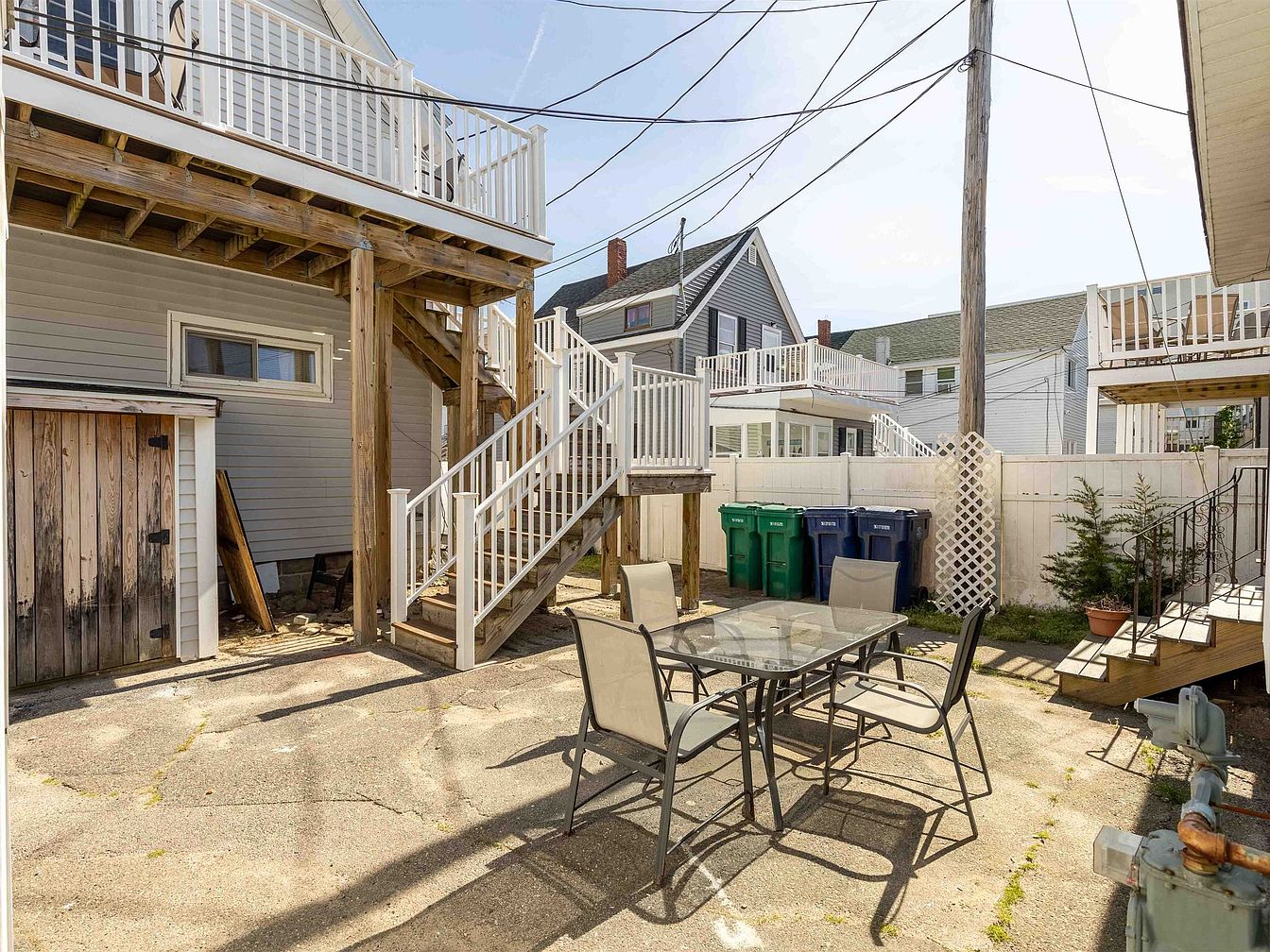 The backyard patio features a rectangular glass-top table surrounded by four metal chairs, offering a simple yet modern aesthetic. The concrete ground exhibits signs of wear, complementing the rustic charm of the wooden stairs leading to the upper deck, which has white railings adding to its clean look. A wooden shed with a weathered door stands to the side, enhancing the outdoor character. Green recycling bins are neatly arranged against a white fence that creates a sense of privacy. Lattice work and a small potted plant introduce a touch of greenery, enriching the space with warmth and inviting leisure.