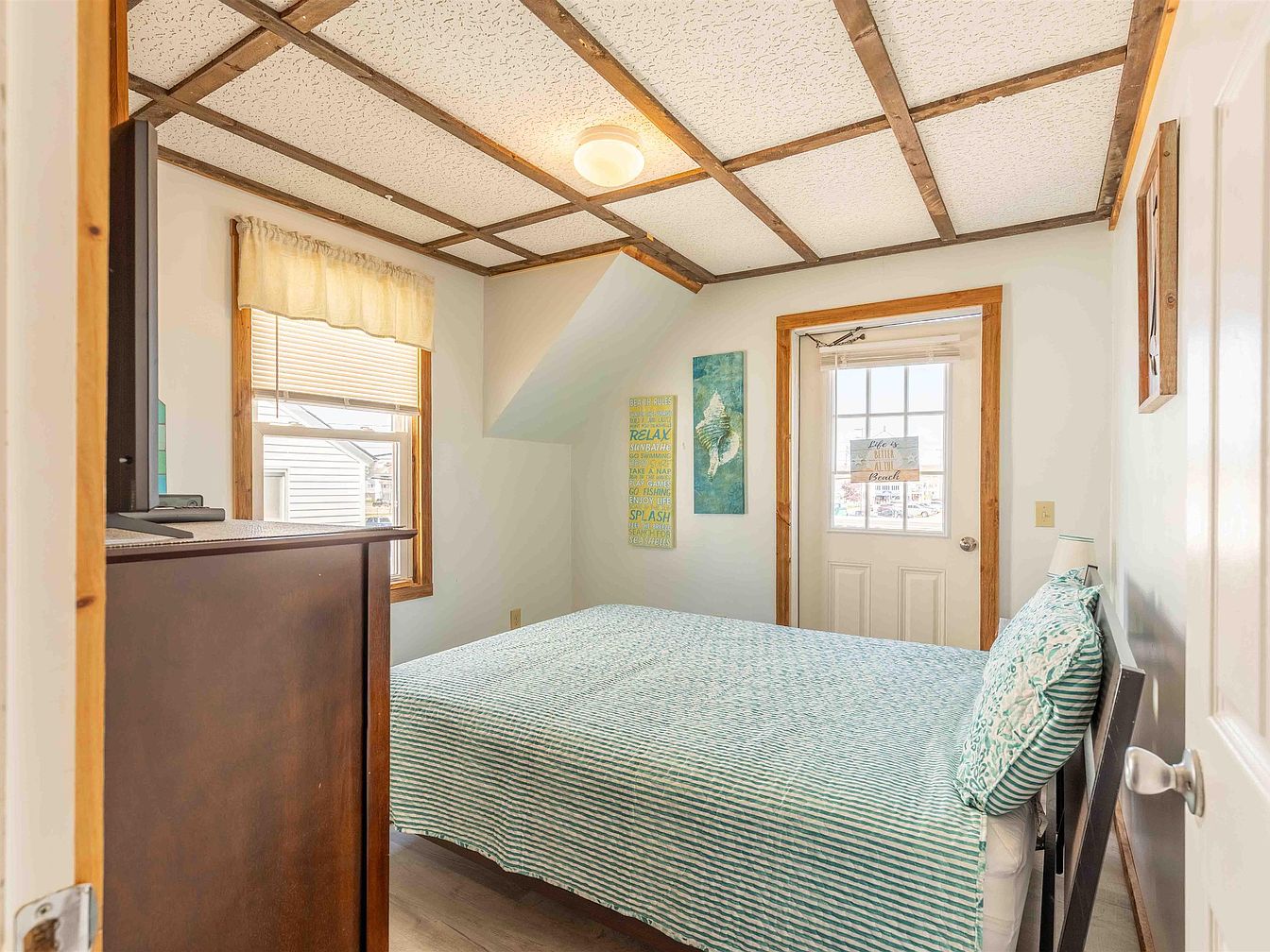 This cozy bedroom features a serene atmosphere with its light color palette, dominated by soft whites and aquas. A comfortable bed is neatly made with a striped aqua and white duvet, complemented by decorative pillows. To the left, a wooden dresser in rich dark tones stands against the wall. Natural light floods through a sunny window adorned with a light textural curtain. Architectural charm is highlighted by the textured, white ceiling, featuring exposed wooden beams that add warmth. A wooden door with a glass panel leads outside, enhancing the room’s inviting feel. Colorful wall art infuses personality.