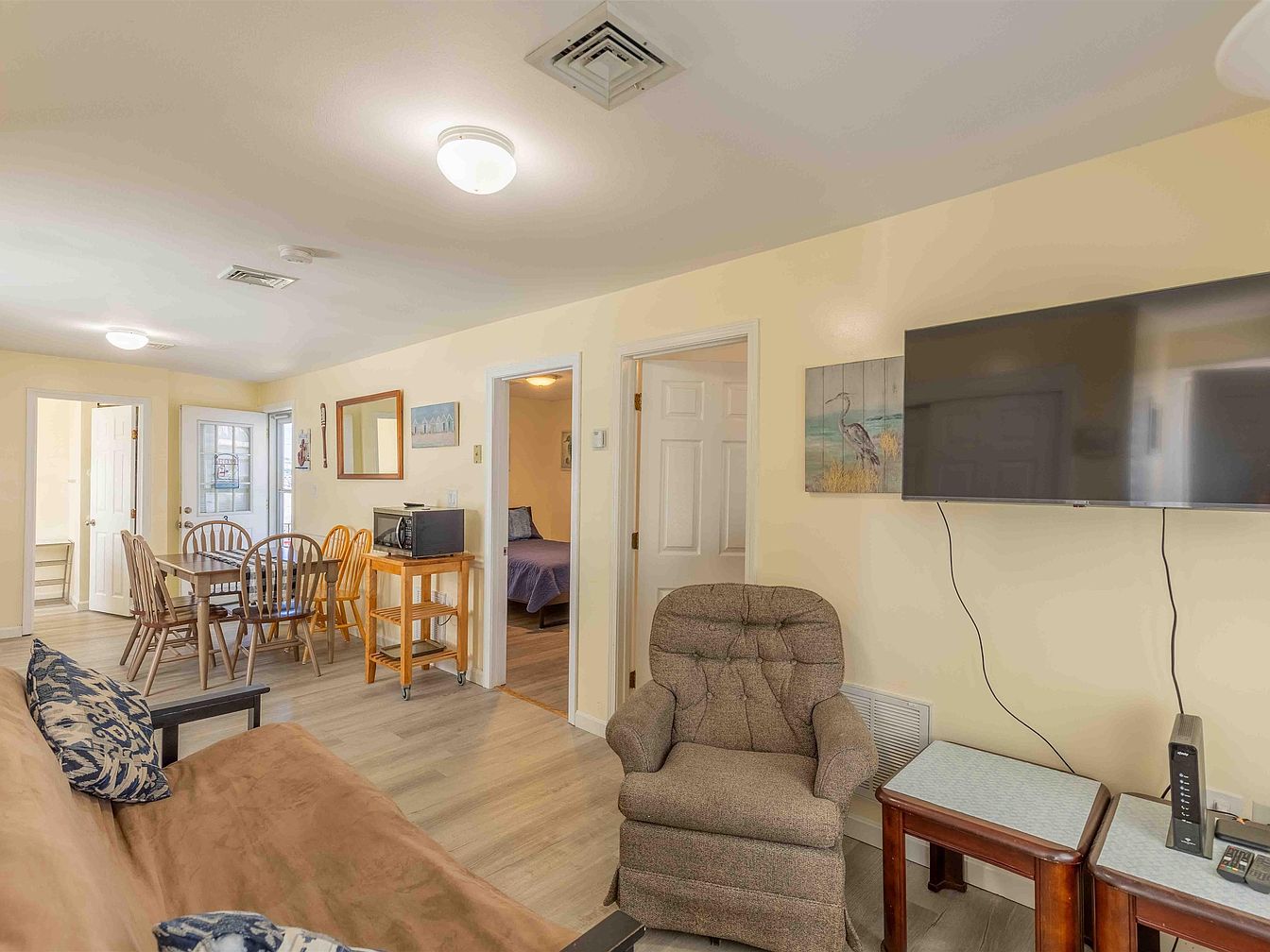 This living area features a cozy and inviting layout, with light beige walls that enhance the room’s brightness. A plush brown sofa is arranged to foster conversation, complemented by patterned throw pillows for added color. A recliner offers a comfortable seating option beside a contemporary coffee table. The dining area showcases a medium-sized wood table surrounded by four matching chairs, perfect for gatherings. A large flat-screen TV is mounted on one wall, while a piece of art depicting a heron adds a touch of charm. The space flows effortlessly to the kitchen and other rooms, emphasizing accessibility.