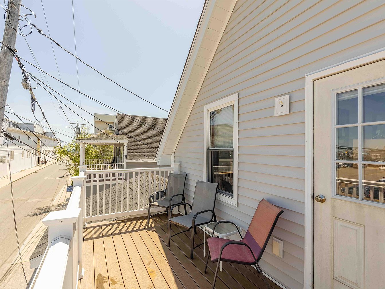 This balcony space features a simple yet inviting design, with a light gray, horizontally paneled exterior and a wooden floor that creates a warm atmosphere. Two metal chairs, one black and one maroon, provide seating for relaxation, each oriented to enjoy the surrounding view. A white railing adds a clean contrast and safety, while the adjacent door is framed with multiple window panes, enhancing natural light. Power lines and neighborhood views suggest a quiet urban setting. Overall, the space combines functionality with aesthetics, making it an ideal spot for casual gatherings or solitude in a bustling area.