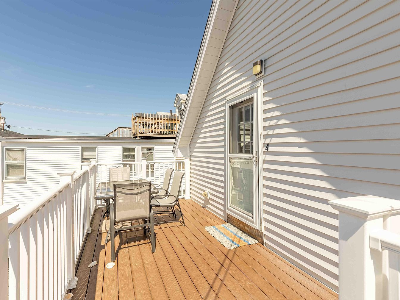 An inviting outdoor deck features smooth wooden flooring with a warm brown hue. A glass-top table surrounded by four sleek, modern chairs offers a perfect spot for enjoying meals or drinks. A soft, striped mat lies at the entry, adding a pop of color and comfort. The deck is bordered by white railings that enhance the airy feel, complemented by the bright natural light illuminating the space. Simple architectural lines of the house rise above, with a sloping roof contributing to the relaxed vibe. The backdrop includes a blue sky, perfect for leisure activities and outdoor gatherings.