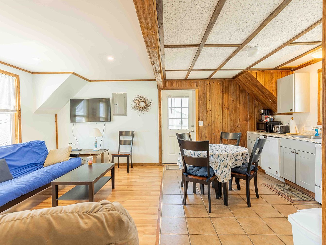 The space features an open layout, combining seating and dining areas. Light wood flooring contrasts with dark brown paneling, enhancing warmth. A blue futon and beige armchair offer comfortable seating, paired with a minimalist black coffee table. Across from the seating is a sleek white kitchen with gray countertops, integrating modern appliances. A round dining table draped in a floral tablecloth accommodates four black chairs, creating an inviting dining atmosphere. Natural light floods through large windows, highlighting the ceiling’s textured design. Decorative touches, like a wall-mounted television and a rustic wreath, add personality to the room.