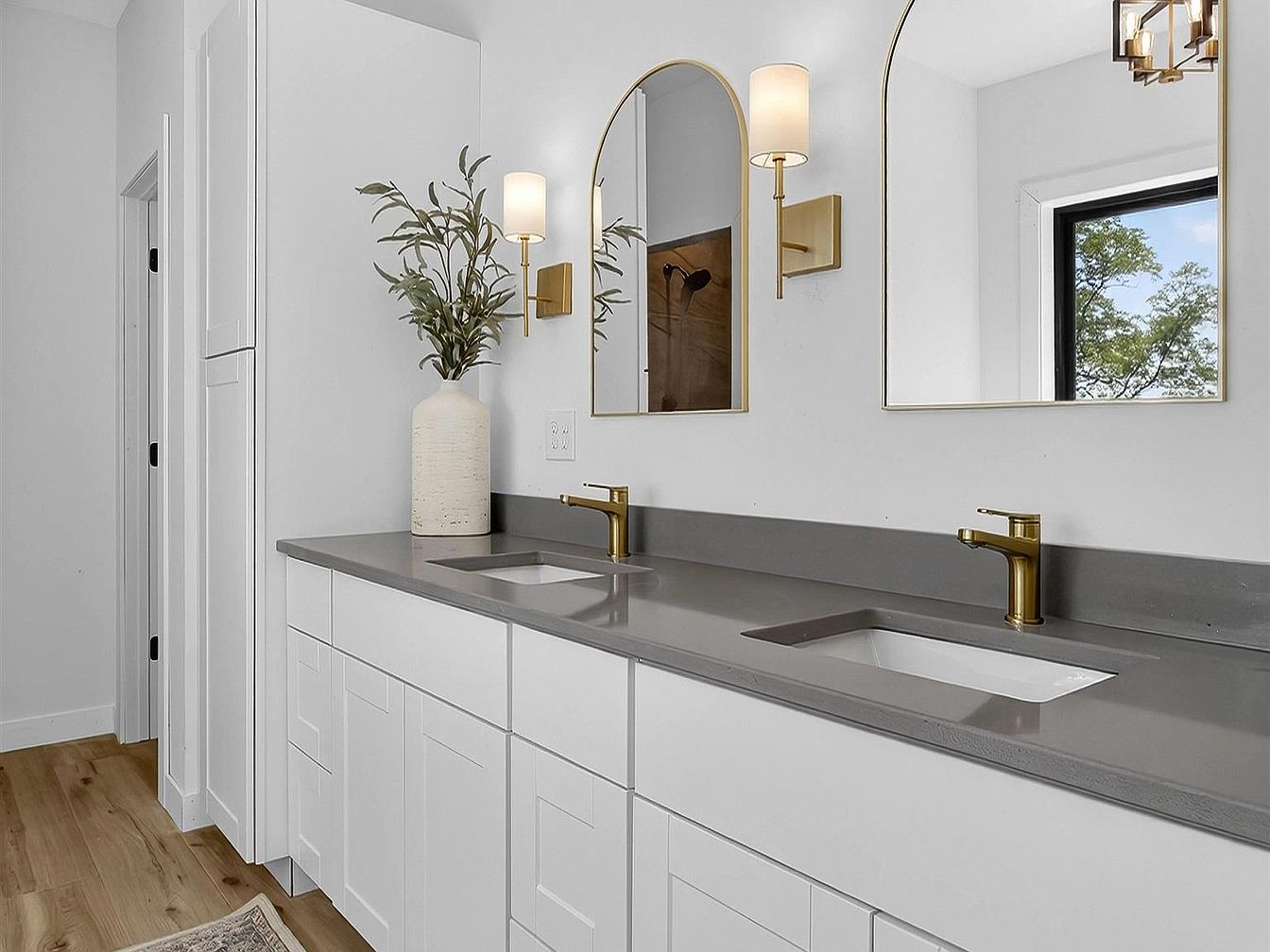 A long, dual-sink vanity features flat-panel white cabinetry and sleek gray countertops, topped with simple under-mount rectangular sinks. Polished brass faucets and hardware add a touch of warmth and glamour. Two large, arched mirrors are mounted on the wall, framed in brass to match the fixtures. Above each mirror, a wall sconce with a cylindrical white shade provides soft, ambient lighting. Natural wood flooring contrasts gently with the otherwise crisp, white walls. A tall storage cabinet stands at one end of the vanity, while a large ceramic vase with greenery adds a decorative, organic touch to the clean, modern aesthetic.