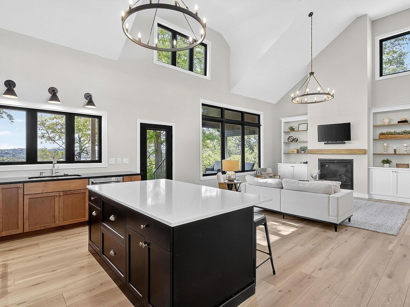 A spacious open-concept area combines kitchen and living room, unified by high vaulted ceilings and large black-trim windows that flood the space with natural light. The kitchen features wooden lower cabinets paired with a contrasting black island adorned with a sleek white countertop. Three matte black wall sconces hang above the kitchen sink, emphasizing a modern farmhouse style. In the adjoining living area, a simple white sectional faces a minimalist fireplace with a wooden mantel, flanked by built-in shelves and cabinets. Soft neutral tones and blonde wood flooring create a warm, airy, and inviting atmosphere.