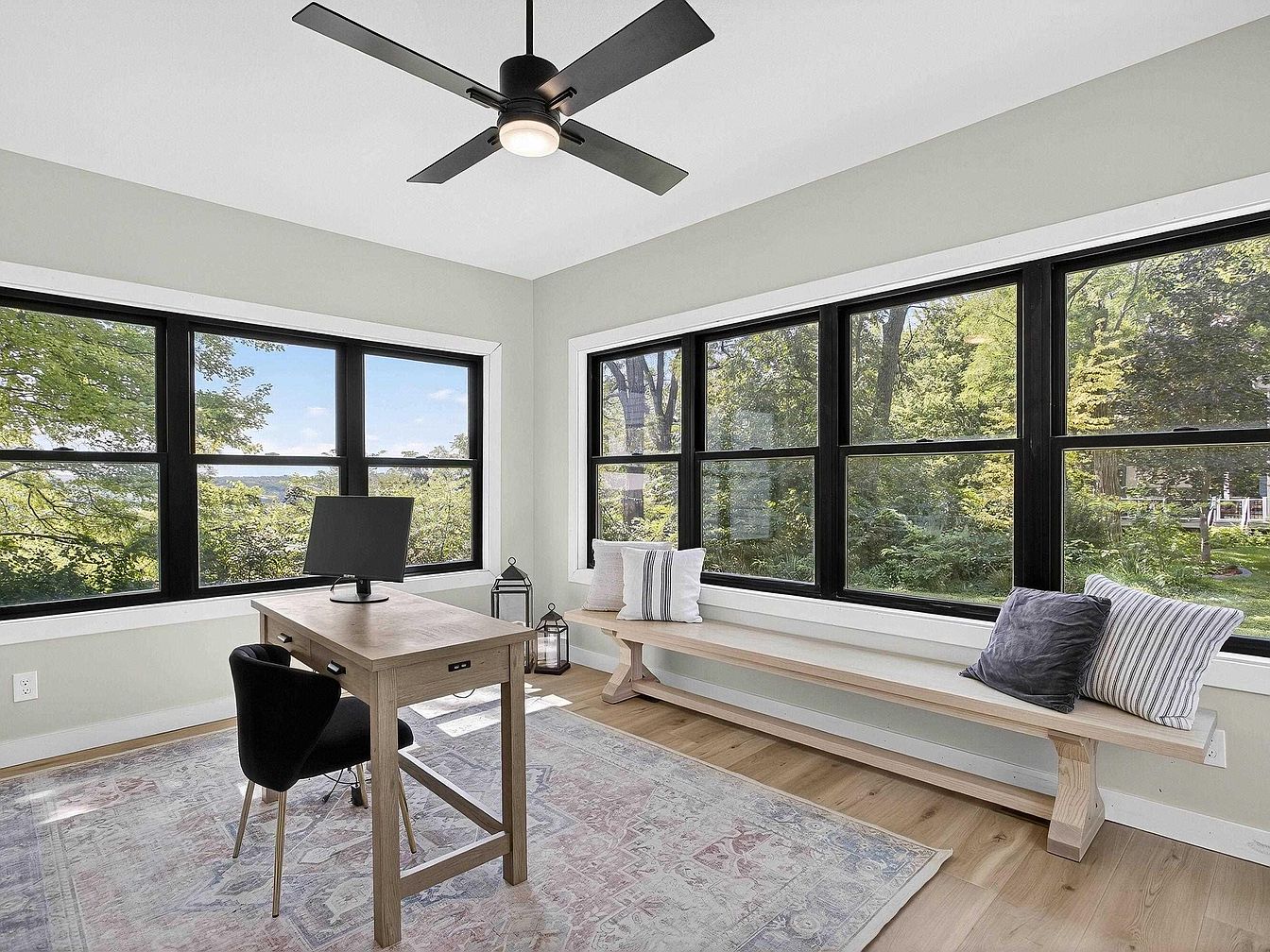 A bright corner room with large black-trim windows wraps around two sides, framing lush green outdoor scenery and flooding the space with natural light. The room features pale gray walls and light wood flooring. At the center sits a simple wooden desk with a black modern chair and a single monitor. To the right, a minimalist light wood bench rests below the windows, adorned with striped and soft gray throw pillows for comfort. The ceiling fan above is black, maintaining sleek, contemporary lines. A faded, patterned area rug underlines the cozy yet functional, serene workspace atmosphere.
