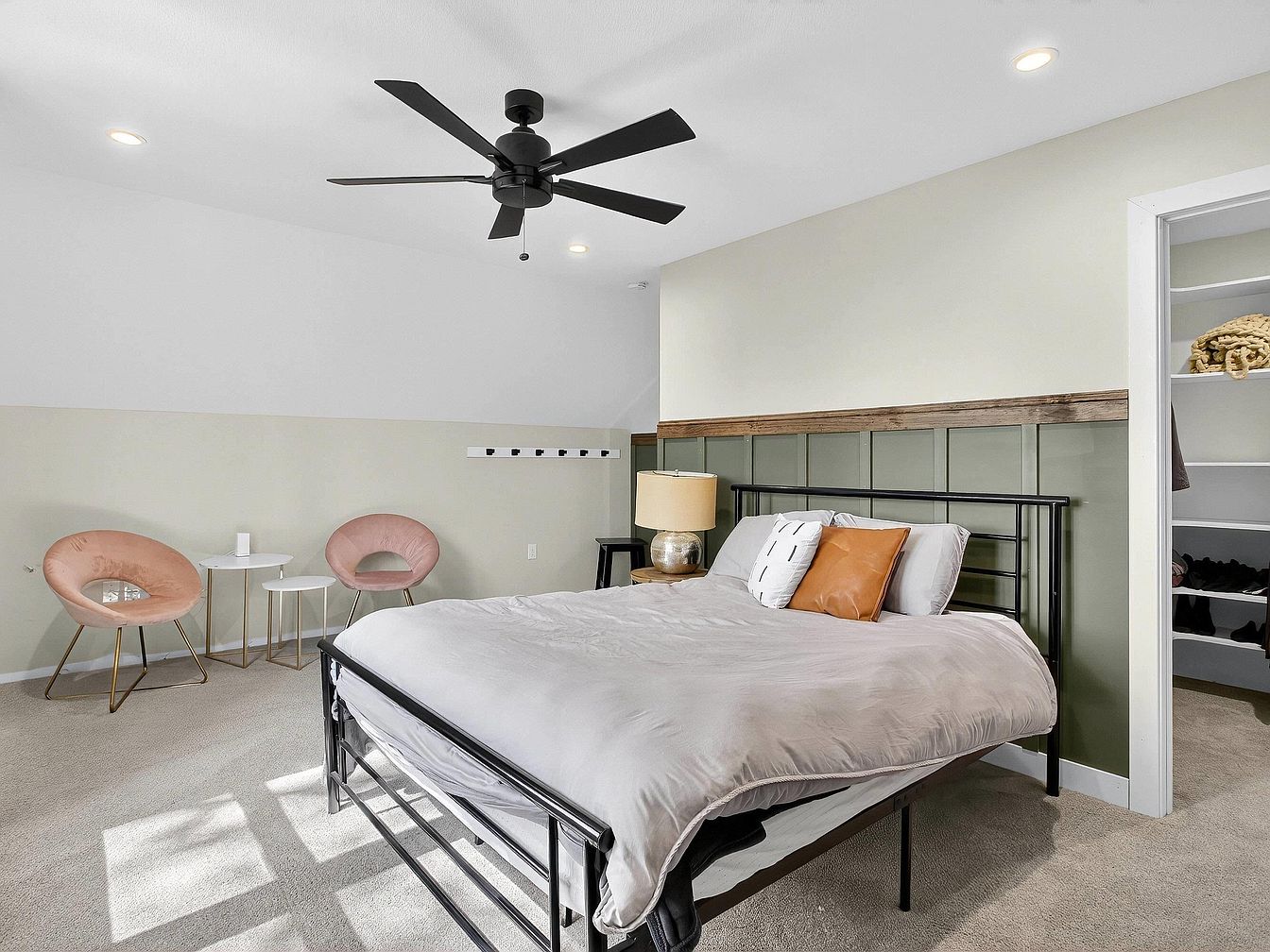 A spacious bedroom features a modern black metal bed frame topped with a soft gray comforter and decorative accent pillows in white and tan. The wall behind the bed has a two-tone design: sage green paneling with a rustic wood trim, and pale beige paint above. To the left of the bed, two blush pink velvet chairs with gold legs flank a set of small white nesting tables, creating a cozy sitting area. A gold lamp with a large shade sits on a wooden nightstand. The room is carpeted in soft beige and is illuminated by recessed ceiling lights and a large black ceiling fan.