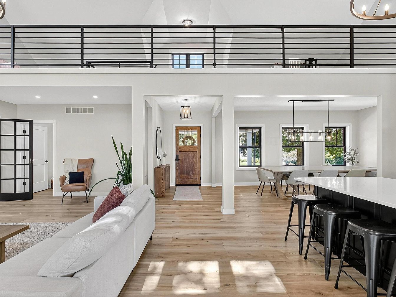 A spacious open-plan living area featuring light wood flooring and bright white walls, illuminated by natural sunlight streaming through large windows. The space is arranged with a modern white sectional sofa accented with a burgundy throw pillow, near a cozy reading nook consisting of a tan leather chair with a black and cream cushion and a live green plant. The entryway showcases a rustic wooden front door with a lantern-style light fixture above, flanked by a simple console table and circular mirror. To the right, a dining area with a rectangular table and six upholstered chairs sits under a sleek geometric chandelier, and the kitchen island includes four black metal bar stools, creating a seamless flow between spaces. Strong horizontal lines from the black stair railing add a contemporary touch above the open floor plan.