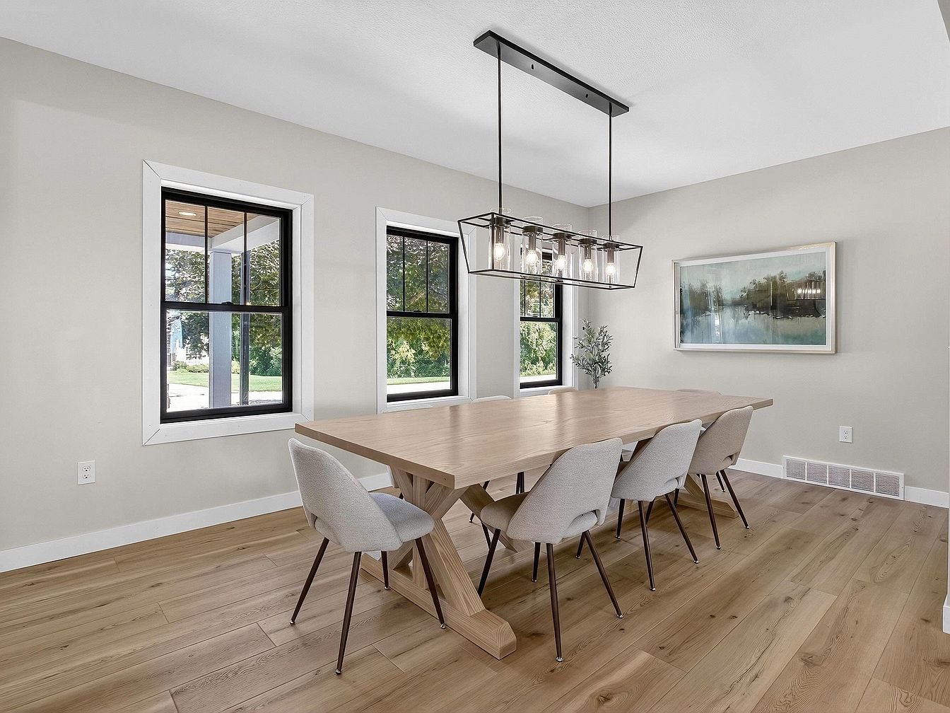 A long, natural wood dining table takes center stage in a bright, inviting room, surrounded by six light-gray upholstered chairs with sleek black legs. The space features warm-toned, wide-plank hardwood flooring and neutral light gray walls. Three tall, black-trimmed windows line one side of the room, letting in ample natural light and offering a view of greenery outside. A modern rectangular chandelier with exposed bulbs hangs above the table, adding a touch of contemporary elegance. Minimalist décor includes a large landscape artwork on the wall and a small green plant in the corner, contributing to a serene, uncluttered atmosphere.