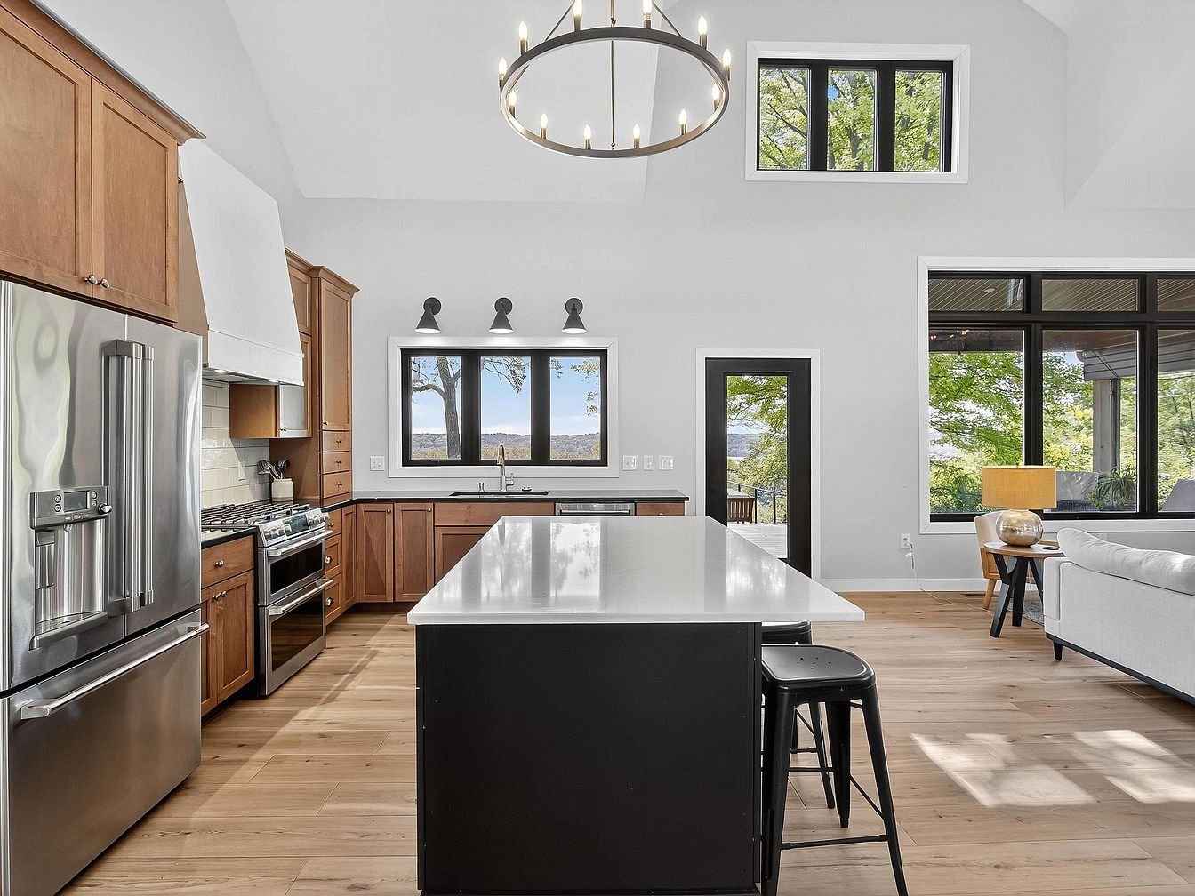 Spacious kitchen with a large white island countertop at the center, paired with two black metal stools. Warm wooden cabinetry contrasts with stainless steel appliances, including a double-door fridge and modern oven. Light wood plank flooring runs throughout, complementing the white walls and tall ceilings. A striking black-framed window over the sink allows natural light and offers views of trees and water. Minimalistic black sconces line the top of the window, and an elegant circular chandelier hangs above. The open layout flows into a bright living area, partially visible with a light gray couch and a contemporary table lamp.