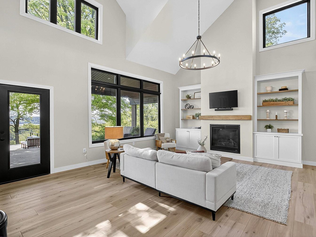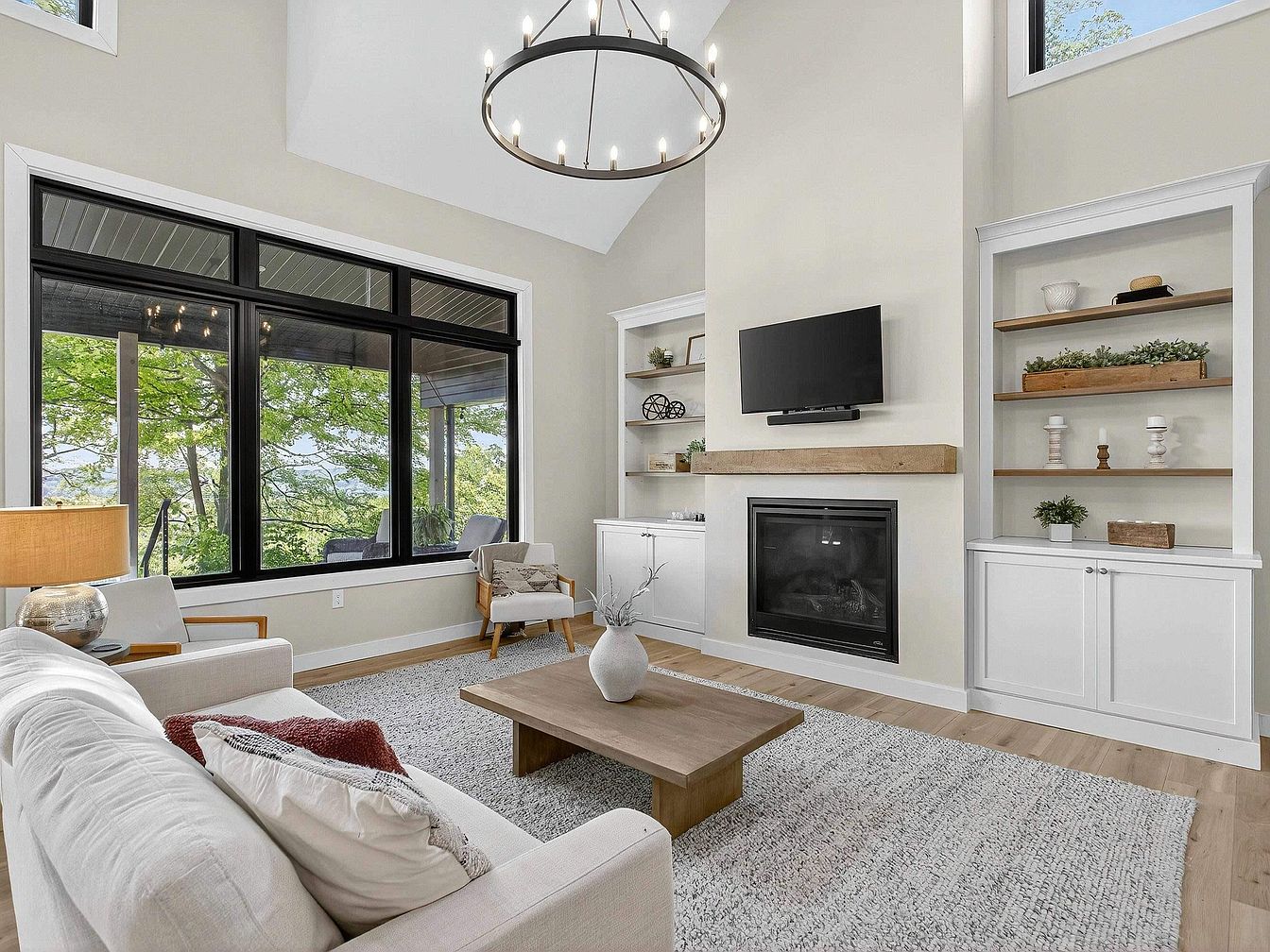 Spacious living area with high ceilings and large black-trimmed windows offering views of lush, green trees outside. The room features a modern chandelier and is grounded by a neutral area rug. A white sectional sofa with textured and colored accent pillows sits across from a wooden coffee table. Against the far wall, a sleek fireplace with a rustic wood mantel is topped by a wall-mounted television. Flanking the fireplace are built-in shelves filled with potted plants, decorative objects, and candles. Soft beige walls and light wood flooring create a warm, airy, and inviting ambiance.