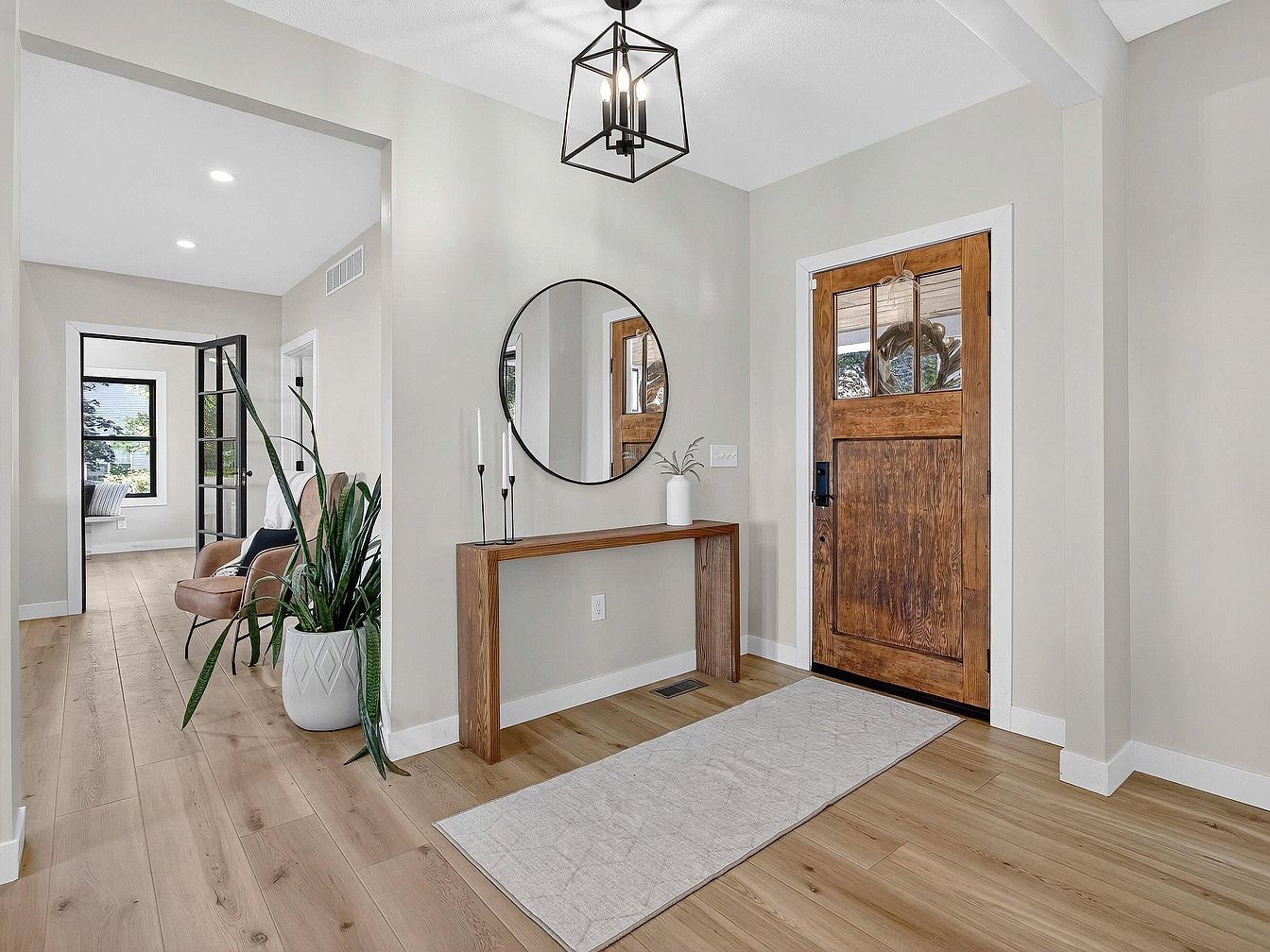 The entryway features a natural wood front door with a prominent grain, framed in white trim, setting a warm tone. Light hardwood floors stretch throughout, complemented by soft beige walls. Against one wall stands a simple wooden console table holding modern black candleholders and a white vase, topped with a large round mirror that reflects the opposite side of the space. A minimalist off-white runner rug grounds the area. To the left, a large potted plant in a white geometric planter adds greenery near a tan leather chair, leading into a sunlit adjacent room with large windows and black-framed glass doors.
