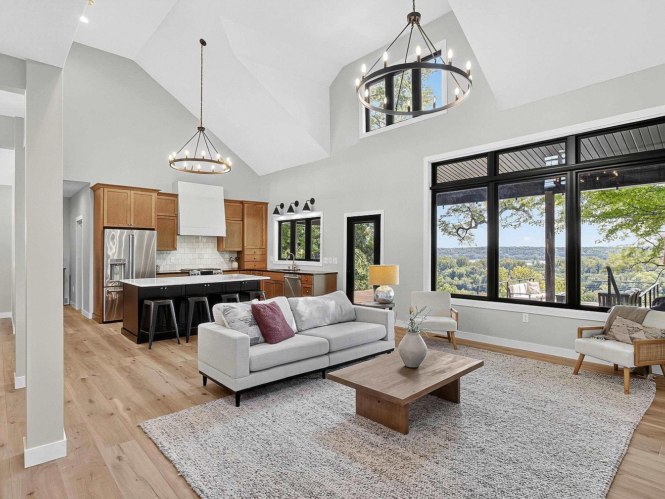 A spacious, open-concept living room merges seamlessly with a modern kitchen. The room features soaring vaulted ceilings with two contemporary black metal chandeliers. Large floor-to-ceiling windows along one wall provide ample natural light and beautiful views of lush green trees and distant hills. The color palette consists of soft gray walls, light natural wood floors, and neutral furnishings, with a pale sectional sofa accented by a plum pillow and two white armchairs on a textured gray area rug. The kitchen showcases warm wood cabinetry, a white tile backsplash, stainless steel appliances, and a dark island with three black barstools.